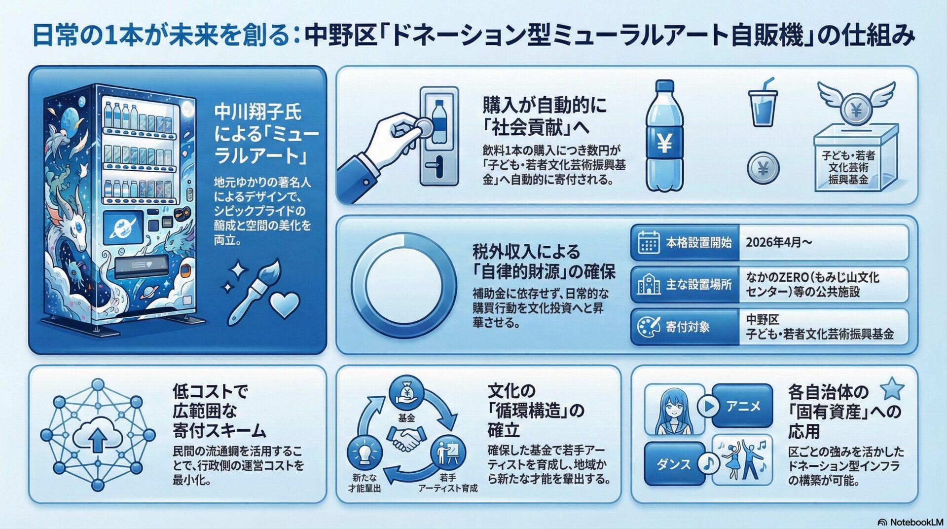 本記事は、東京都中野区とコカ・コーラボトラーズジャパン株式会社が締結した「文化芸術振興に向けた連携協定」に基づき、2026年4月から導入される「ドネーション(寄付)型ミューラルアート自動販売機」の取組を詳述するものです。中野区出身の著名人である中川翔子氏のデザインを起用したこの自動販売機は、日常的な飲料購入を通じて、区の「子ども・若者文化芸術振興基金」へ自動的に寄付が行われる仕組みを備えています。これは単なる官民連携の枠組みを超え、公共空間における「プレイスメイキング」と「持続可能な文化投資」を融合させた先進的な事例といえます。公共施設の未利用スペースを収益化しつつ、地域アイデンティティを醸成し、次世代の文化芸術活動を財政的に支えるという多重の政策意図が組み込まれています。