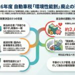 環境性能割の廃止は、自動車税制が「取得・保有」段階から「利用(走行)」段階の課税へとシフトする過渡期であることを示唆しています。EV普及によりガソリン税が激減することを見越し、走行距離に応じて課税する「走行税」の導入が議論されており、今回の廃止はその地ならしという側面もあります。
