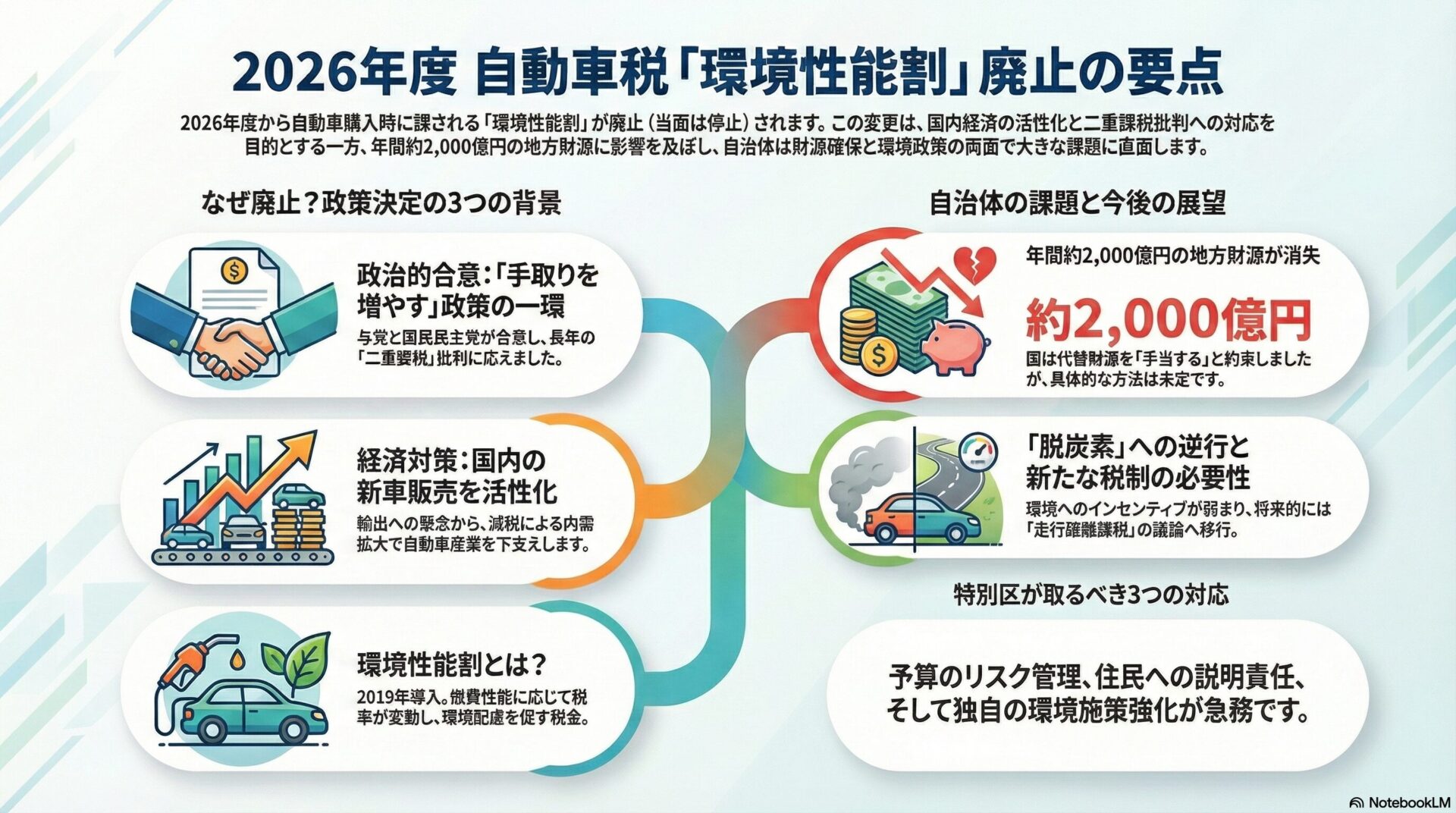 2026年度から実施される環境性能割の廃止は、自動車産業と国内消費を活性化させるための判断である一方、地方財源に大きな穴をあけるリスクを孕んでいます。特別区の職員は、以下の3点を念頭に置くべきです。