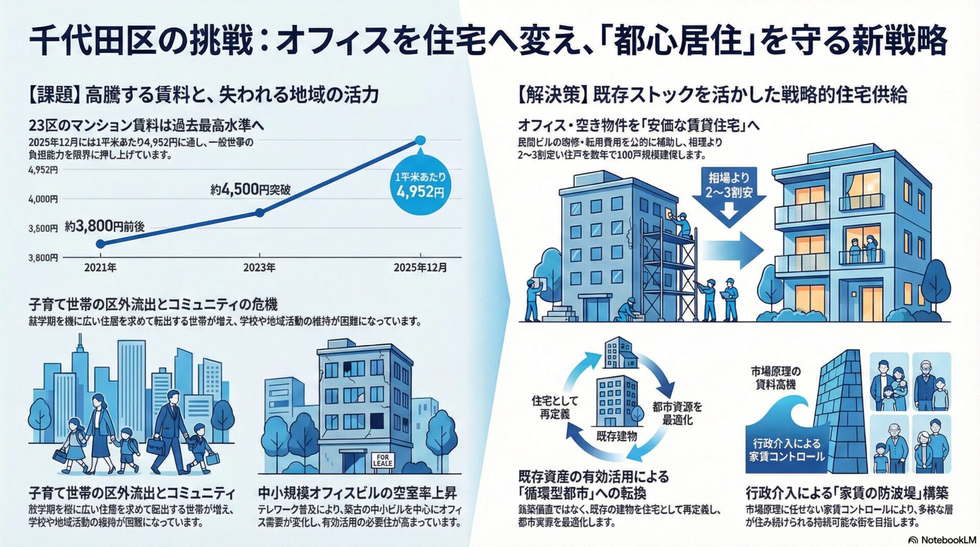 千代田区が打ち出した賃料を2〜3割抑えた住宅供給事業は、単なる住宅福祉の枠を超え、都心の都市構造と人口バランスを再構築するための攻めの政策です。東京23区全体のマンション賃料が1平方メートルあたり5,000円に迫るという現状の中、市場メカニズムの限界を認め、行政が積極的にストックの転換を支援する意義は極めて大きいと言えます。オフィスビルの余剰を住宅の不足に充当するというこのダイナミックな試みが、初期目標を超えて持続的なシステムへと昇華されるかが今後の焦点となります。
