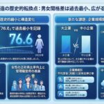 我が国の男女間賃金格差(男性=100)は、長期的には一貫して縮小傾向をたどってきました。比較可能な1976年(昭和51年)当時、女性の賃金水準は男性の60%にも満たない水準(約56程度)で推移していました。その後、1986年の男女雇用機会均等法の施行や、度重なる法改正、さらには近年の女性活躍推進法の制定などを経て、徐々にその差は縮まってきました。令和4年(2022年)には75.7、令和5年(2023年)には74.8と一時的な足踏みも見られましたが、今回の令和7年(2025年)調査では一気に76.6まで上昇し、過去半世紀において最も格差が小さい状態に到達しています。