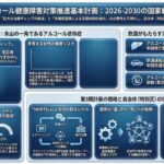 令和8(2026)年3月、厚生労働省はアルコール健康障害対策推進基本計画(第3期)を策定しました。令和8年度から令和12(2030)年度までの概ね5年間を対象とする本計画は、飲酒に起因する健康被害・社会問題が個人の問題にとどまらず、ヤングケアラー・DV・自殺・飲酒運転といった広範な社会課題と密接に絡み合っているとの認識を前提に、国・都道府県・市区町村が一体となって取り組む総合的な行動計画として位置づけられています。第2期計画(令和3〜7年度)の評価を踏まえ、「発生予防」「重症化・再発予防と回復支援」「当事者・家族(こどもを含む)への支援」の三つの重点課題を軸に施策が再編されており、東京都特別区の地域保健・福祉行政においても実務的な指針となる内容を多く含んでいます。本計画が示すデータ・施策の方向性・制度設計の枠組みを体系的に理解することは、特別区が独自の計画・事業を構築するうえで不可欠の基礎情報となります。