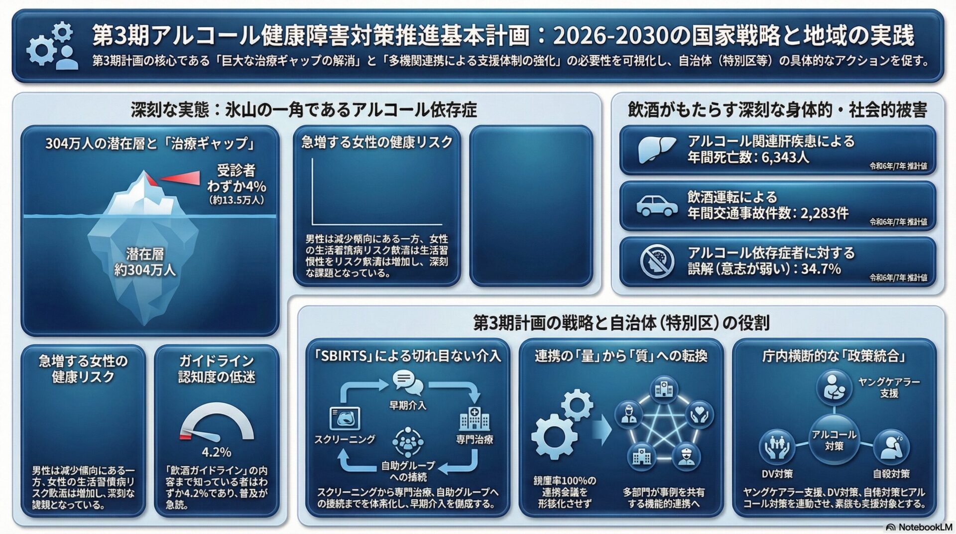 第3期アルコール健康障害対策推進基本計画は、飲酒問題を「個人の嗜好」から「公衆衛生上の複合的社会課題」へと明確に再定位し、令和8(2026)年度から令和12(2030)年度の5年間にわたる国家的対応の枠組みを示した重要な政策文書です。推計304.1万人に上る依存症疑い者に対して実際に医療につながっているのが約13.5万人という巨大な治療ギャップは、アルコール問題が依然として「水面下に沈む氷山」であることを端的に示しており、行政の積極的関与なくしてこの構造を変えることはできません。