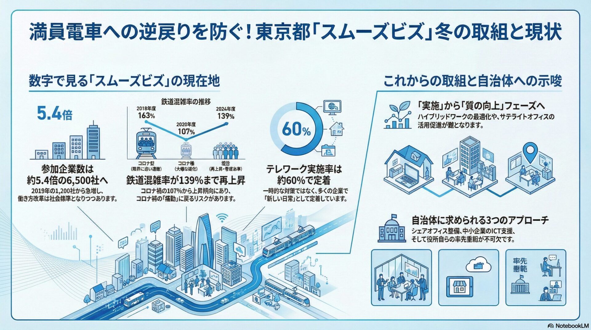 本記事では、東京都の「スムーズビズ」冬の取組について解説しました。重要なポイントは、鉄道混雑率が139%まで戻りつつある今こそ、行政による誘導が必要不可欠であるという点です。参加企業数が6,500社まで拡大した「量」の成果を土台に、今後は中小企業への浸透やハイブリッドワークの定着といった「質」の深化が求められます。各自治体においては、この広域的な動きをテコに、自区の特性(オフィス街かベッドタウンか)に合わせたきめ細やかな支援策を展開することが、住民のQOL向上と地域経済の活性化に直結します。
