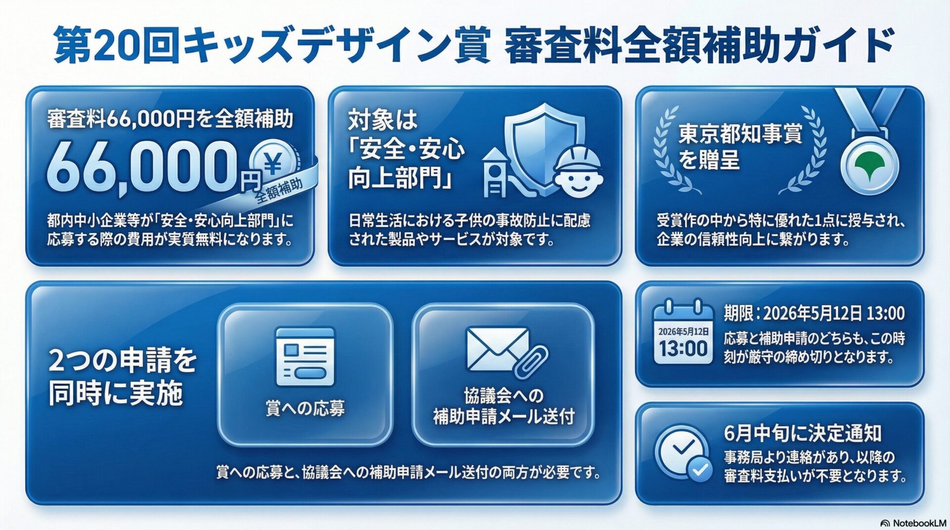 東京都は令和8年3月30日、特定非営利活動法人キッズデザイン協議会が主催する「第20回キッズデザイン賞」の「安全・安心向上部門」に応募する都内中小企業等を対象に、審査料(66,000円)を全額補助する取組を発表しました。あわせて、同部門の受賞作品のうち都内中小企業等による特に優れた1点に対して「東京都知事賞」を贈呈するとしています。