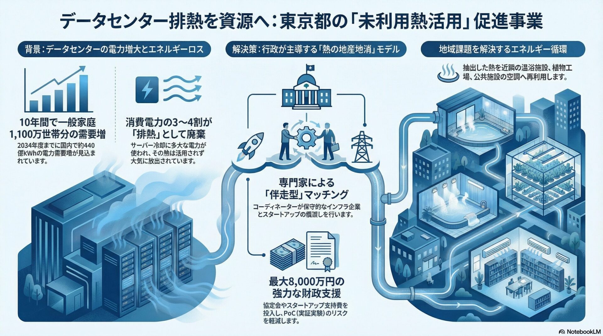 東京都は、AI等の進展に伴うデータセンターの電力需要急増を背景に、2030年の「カーボンハーフ」実現に向けた画期的な施策を展開しています。「スタートアップによる未利用熱活用促進事業」は、これまで廃棄されていたデータセンターの排熱(未利用熱)に着目し、スタートアップの革新的な技術と事業者をマッチングさせるものです。行政がコーディネーターを介して伴走型支援を行い、最大8,000万円の協定金やスタートアップへのサポート費を投入することで、社会実装に向けた実証実験(PoC)を強力に後押しします。本事業は、エネルギー消費の増大という課題を、新たな産業創出と都市の脱炭素化のチャンスへと転換する戦略的な意図を持っています。