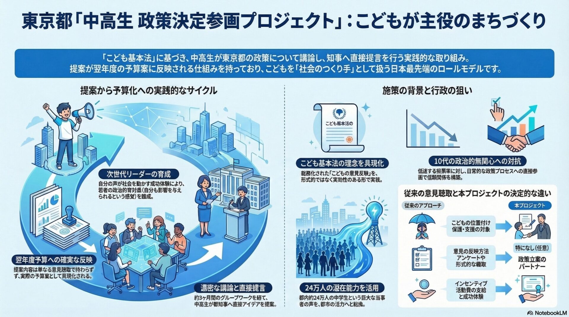 2023年4月の「こども基本法」施行は、我が国の子ども政策における歴史的な転換点となりました。同法第11条では、国や地方自治体が子ども施策を策定・実施・評価するにあたり、対象となる子どもの意見を反映させるために必要な措置を講ずることが明確に義務付けられました。これを受け、各自治体ではこども会議の設置やパブリックコメントの実施など模索が続いていますが、東京都の「中高生 政策決定参画プロジェクト」は、提案から予算反映までの道筋が制度として確立されている点で、全国のロールモデルとなっています。