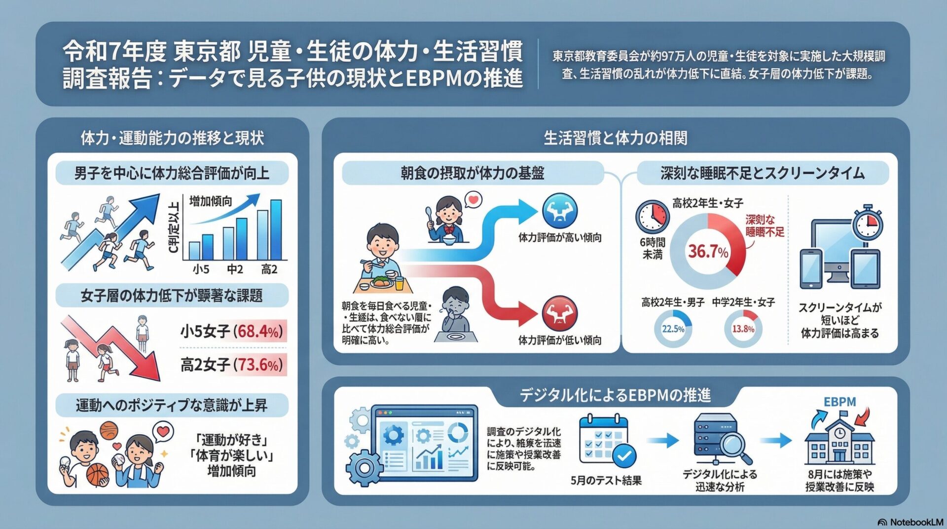 東京都教育委員会は、令和7年度の「東京都児童・生徒体力・運動能力、生活・運動習慣等調査」の結果を公表しました。本調査は、都内公立学校の小学校、中学校、中等教育学校、高等学校、特別支援学校の計2,176校、972,299人の児童・生徒を対象に実施された大規模なものです。調査内容は、新体力テスト実技8種目と、生活・運動習慣等の実態に関する質問紙調査から構成されています。得られたデータからは、子供たちの体力総合評価の経年変化や、朝食の摂取、睡眠時間、スクリーンタイムといった生活習慣が体力に与える影響が浮き彫りになっています。エビデンスに基づく政策立案(EBPM)が求められる現在、特別区の行政職員の皆様におかれましては、本データを地域特性に合わせた施策展開の基礎資料として活用していくことが強く期待されます。