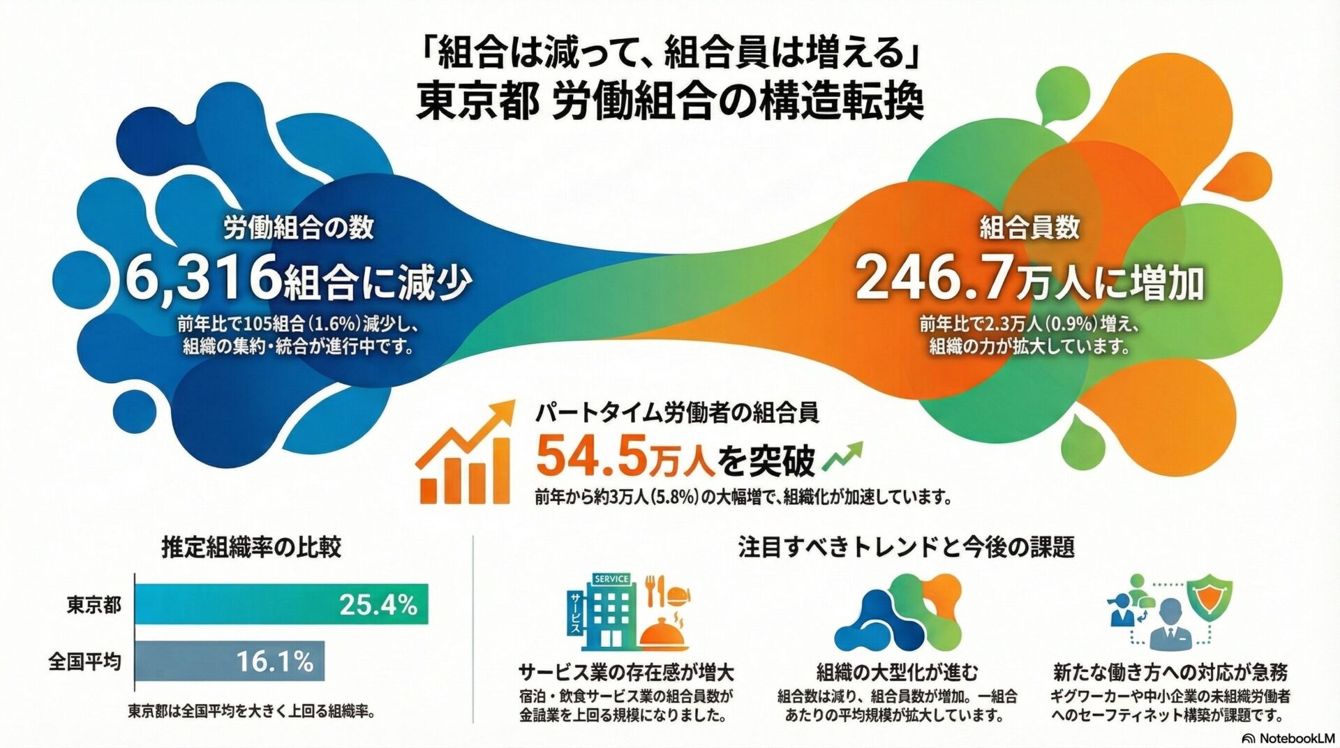 - 数値で見る組織動向: 労働組合数は6,316組合(前年比105組合減)であり、組合員数は246万7,270人(前年比2万3,177人増)と、組織の集約化が進んでいる。