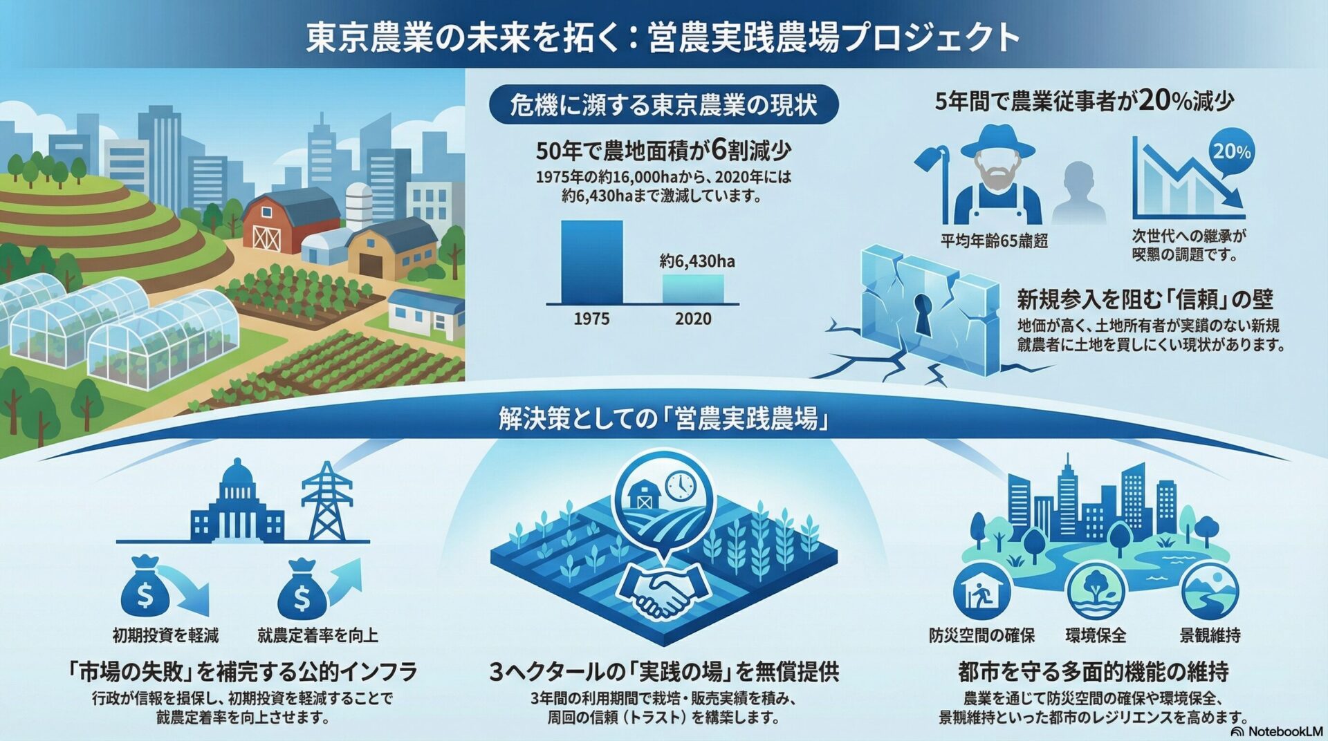 この取組は、単なる一産業の振興策ではなく、都市のレジリエンス(強靭性)を高め、次世代に豊かな環境を引き継ぐための戦略的なインフラ整備であると捉えるべきです。自治体職員には、この農場を起点として生まれる新しい農業の形を注視し、それぞれの地域特性に応じた形で、生産者と消費者の橋渡しを行う役割が期待されています。東京という巨大都市において農業が共生し続けるためには、こうした現場レベルでの実践と、それを支える行政の柔軟な発想が不可欠なのです。