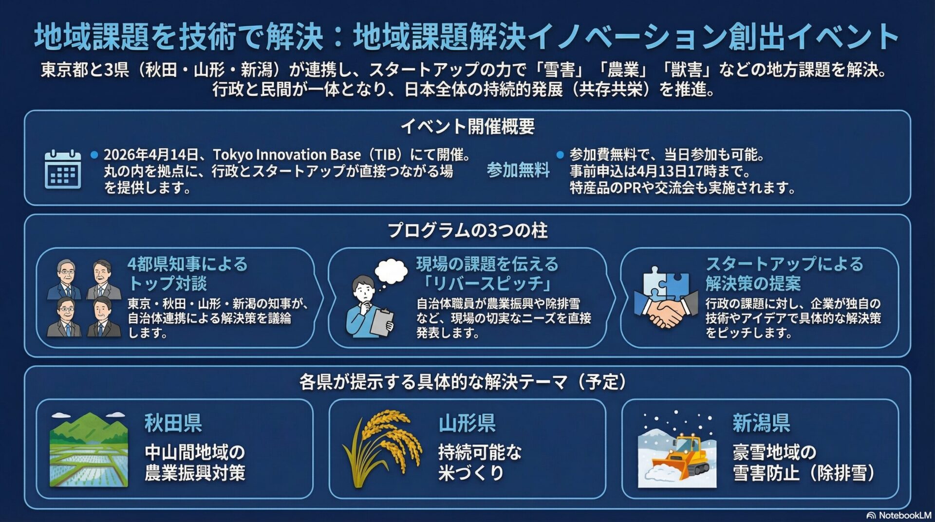 東京都が自区内の課題解決にとどまらず、秋田県、山形県、新潟県といった他県と合同でイベントを開催する意図は、東京に集積するスタートアップの技術力を全国の課題解決に振り向け、地方創生に貢献することで、「東京の一極集中」という批判をかわしつつ、オールジャパンでの「共存共栄」のエコシステム(生態系)を主導する点にあります。