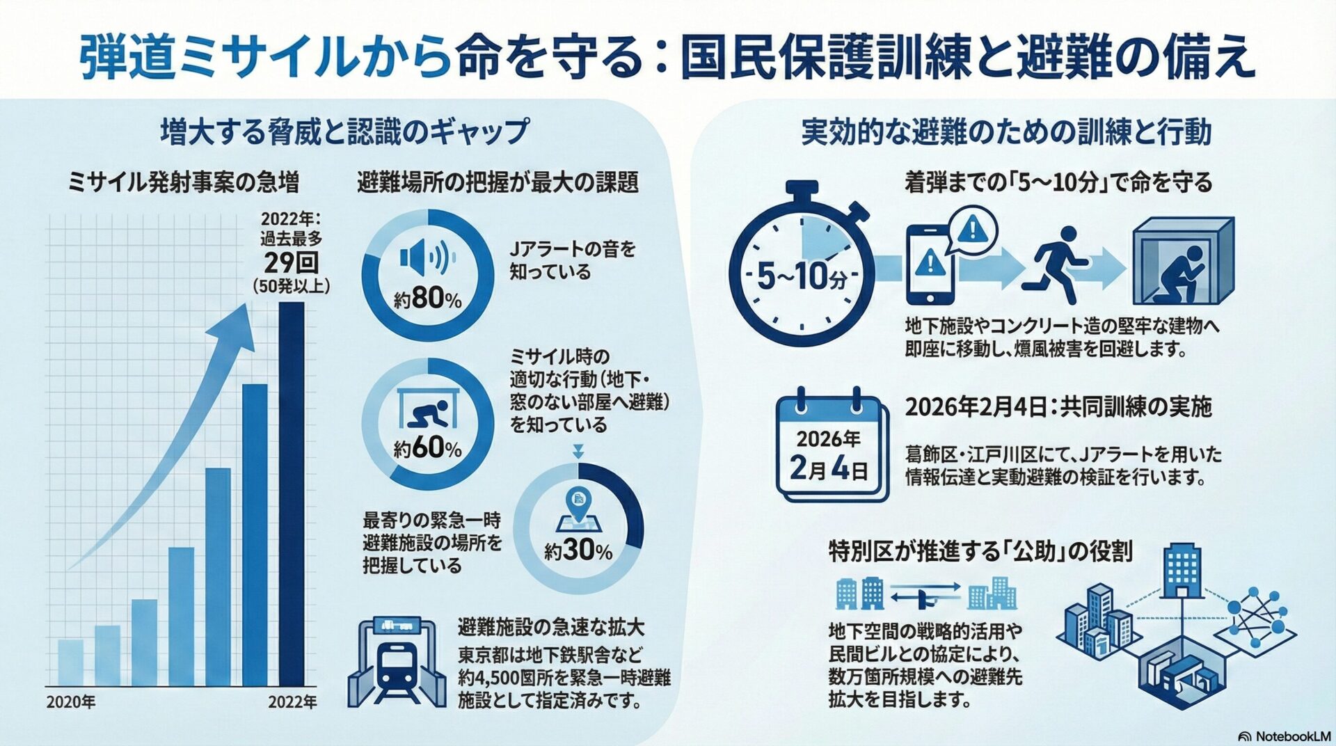 - 自宅や勤務先の最寄りの緊急一時避難施設の場所を把握している:約30% Jアラート自体の認知度は高いものの、具体的な避難先の把握率が3割に留まっている現状が、今回の訓練のような地域密着型の実動演習を必要とする最大の動機となっています。