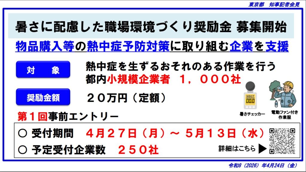 東京都は、激甚化する夏季の猛暑から労働者を守るため、令和8年度の新規事業として「暑さに配慮した職場環境づくり奨励金」を創設しました。 本事業は、都内の小規模企業者が、厚生労働省の指針に基づいた熱中症予防対策を実施し、必要な物品を購入することを支援するものです。 奨励金額は1社につき20万円(定額)と設定されており、年間を通じて計1,000社の採択を予定しています。 本記事では、この新たな支援策の背景にある社会課題、行政側の意図、そして特別区の政策立案における示唆について、客観的なデータを交えながら詳細に整理します。