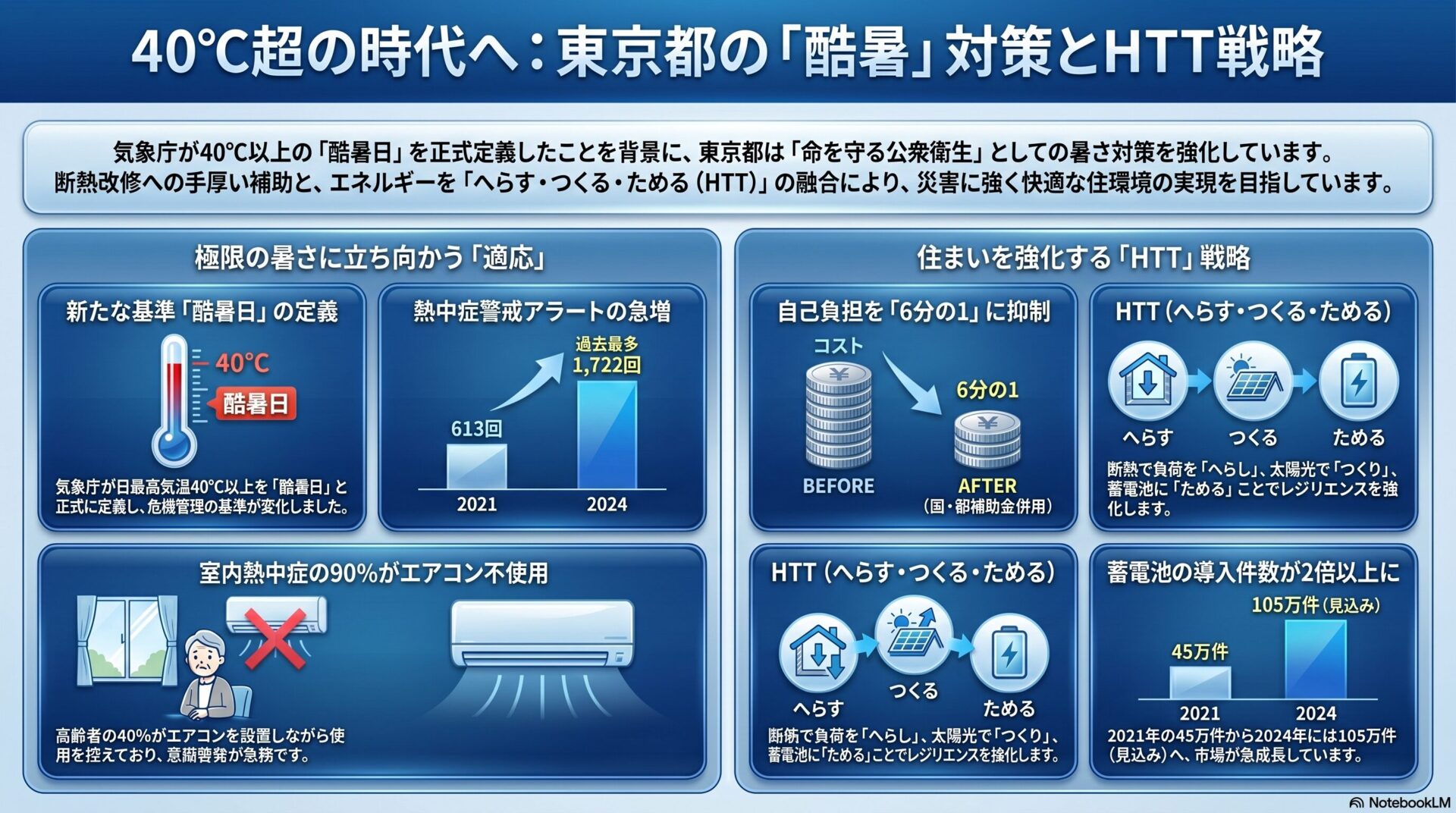 本記事では、東京都が打ち出した最新の暑さ対策および省エネ・再エネ支援策の全容を整理し、自治体における政策立案の要諦を解説します。 2026年4月17日、気象庁が最高気温40℃以上の日を「酷暑日」と定義したことは、都市経営における環境リスクが新たなステージに入ったことを象徴しています。 行政に求められるのは、対症療法的な啓発に留まらず、住環境の物理的な「断熱化」と、エネルギーの「地産地消」を官民一体で推進する構造的な変革です。 特に、国と都の補助金を組み合わせることで自己負担を約6分の1にまで圧縮できる窓の断熱改修支援や、太陽光発電・蓄電池への手厚い補助は、都民の生活防衛と都市のレジリエンス強化を同時に達成する極めて戦略的な施策です。 本記事では、これらの取り組みが持つ客観的根拠と、現場レベルで求められる政策的示唆を提示します。