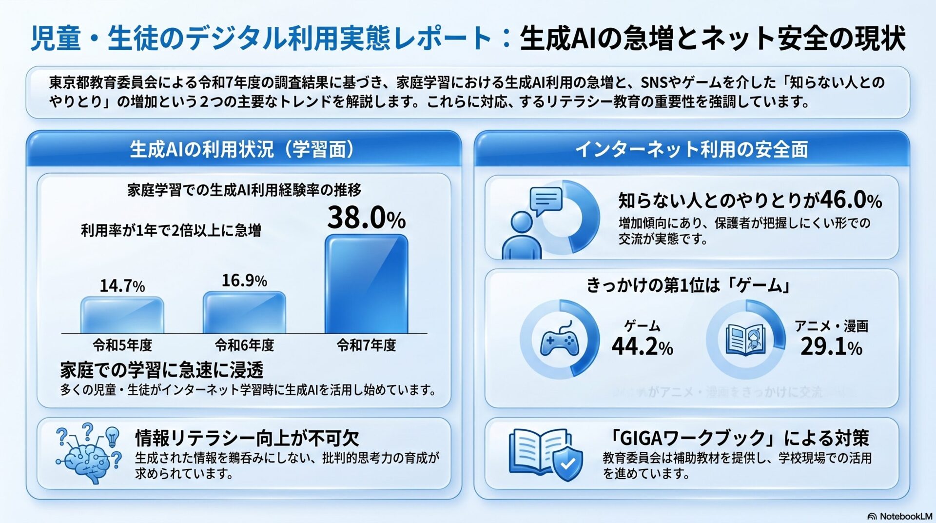 今回の調査結果は、生成AIが児童・生徒の日常生活において急速に一般化し、もはや無視できない学習インフラとなったことを示しています。わずか1年で利用率が倍増した事実は、行政の対応スピードが技術の普及速度に追いつかなければならないという強い警告でもあります。また、ゲームをきっかけとした見知らぬ他者との交流増は、利便性の裏にあるリスクがより巧妙かつ不可視化している現状を物語っています。