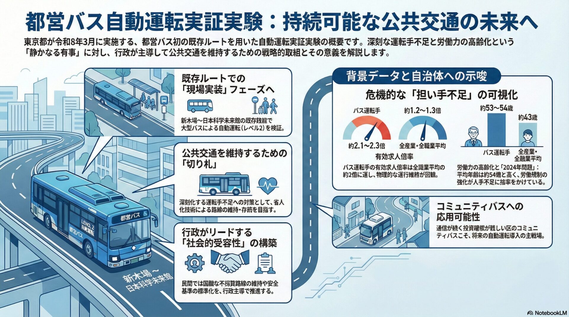 東京都特別区の職員の皆様、日々の業務お疲れ様です。本記事では、令和8年(2026年)1月23日に小池都知事より発表された「都営バスにおける自動運転の実証走行」について、その概要と背景にある客観的データ、そして政策立案のプロとして考える「行政が取り組むべき理由」を整理・解説します。