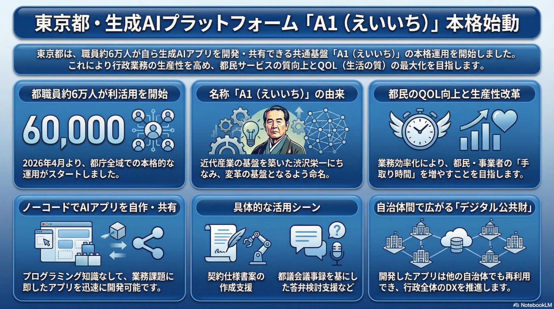 約7か月の試行運用を経て、2026年4月9日に正式名称「A1(えいいち)」として都職員約6万人を対象とした本格運用が開始されました。渋沢栄一の近代産業基盤構築という歴史的功績になぞらえた命名は、このプラットフォームが単なる業務ツールではなく、都政変革の基盤インフラとして位置付けられていることを示しています。