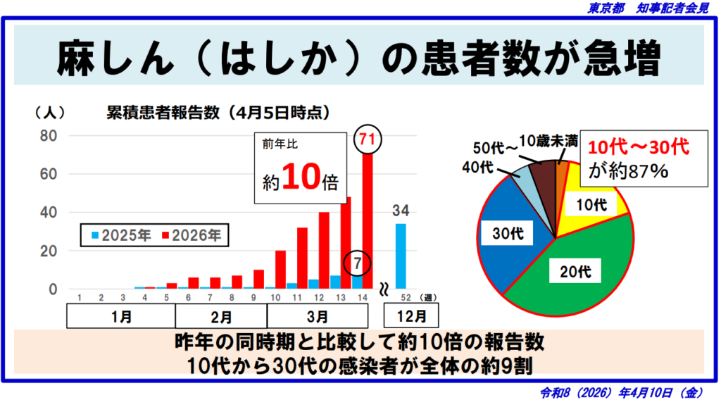 令和8(2026)年4月10日の東京都知事記者会見において、都内における麻しん(はしか)患者数の急増が公表されました。4月5日時点での累積患者報告数は71人に達しており、前年同時期の7人と比較して約10倍という深刻な水準となっています。患者の年齢層は10代から30代が全体の約87%を占め、若年層を中心に感染が急拡大している状況です。