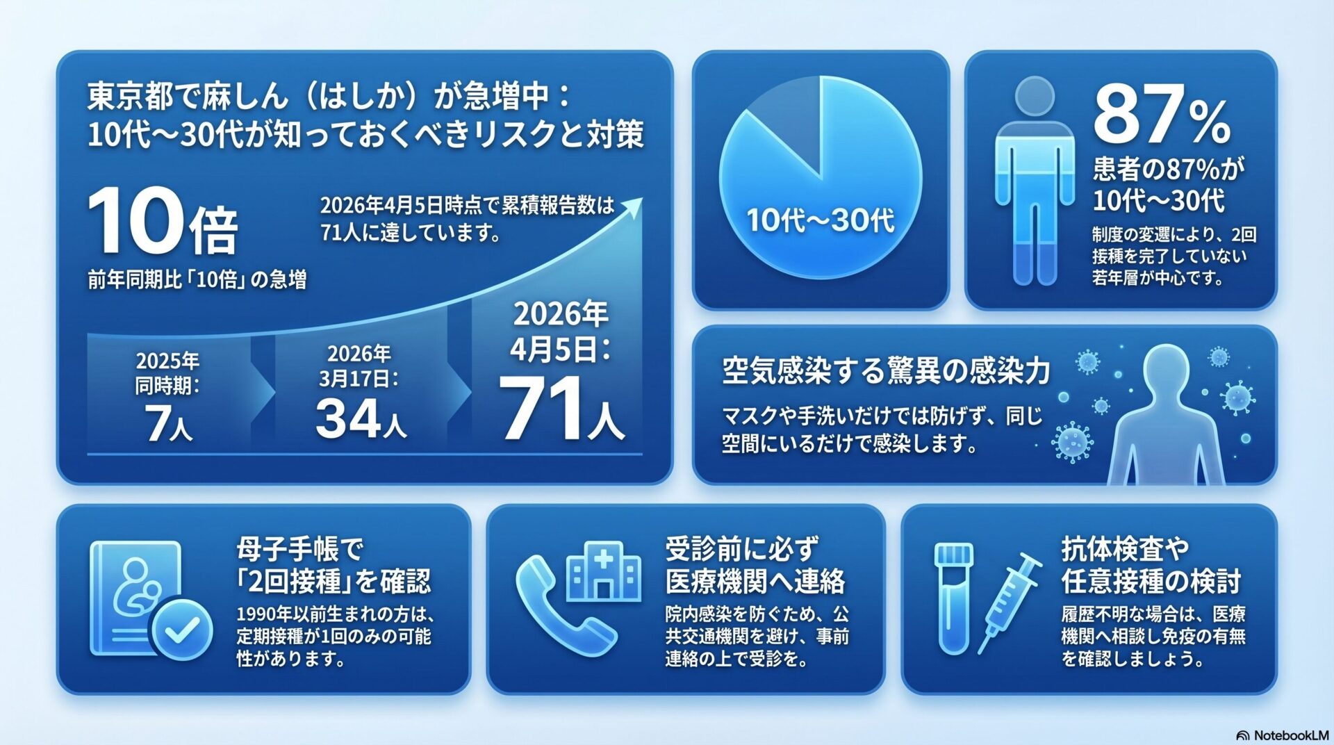 令和8年4月5日時点で都内の麻しん累積患者報告数は71人と、前年同期比約10倍に急増しており、その約87%が10代から30代の若年層に集中しています。麻しんは感染力が極めて強く、空気感染という経路を持つため、マスクや手洗いのみでの予防は困難であり、ワクチン接種が事実上唯一の根本的予防手段です。都は母子手帳での接種歴確認・抗体検査・ワクチン接種という具体的行動を呼びかけていますが、2回接種の制度が整う前に成長した世代が現在の若年成人層に当たるという制度的背景が感染拡大を下支えしており、行政による積極的なアウトリーチが求められます。