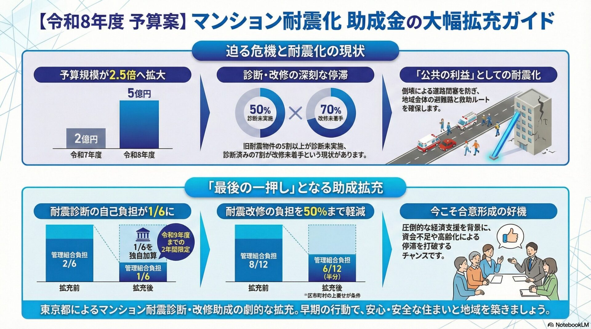 耐震改修については、区市町村が独自に補助を上乗せした場合に限り、都がさらに1/12を加算する仕組みを導入しました。改修工事は診断に比べて桁違いの費用を要するため、負担割合が8/12から6/12(50%負担)に軽減されることのインパクトは極めて大きく、これまで資金不足で断念していた組合への強力な支援となります。