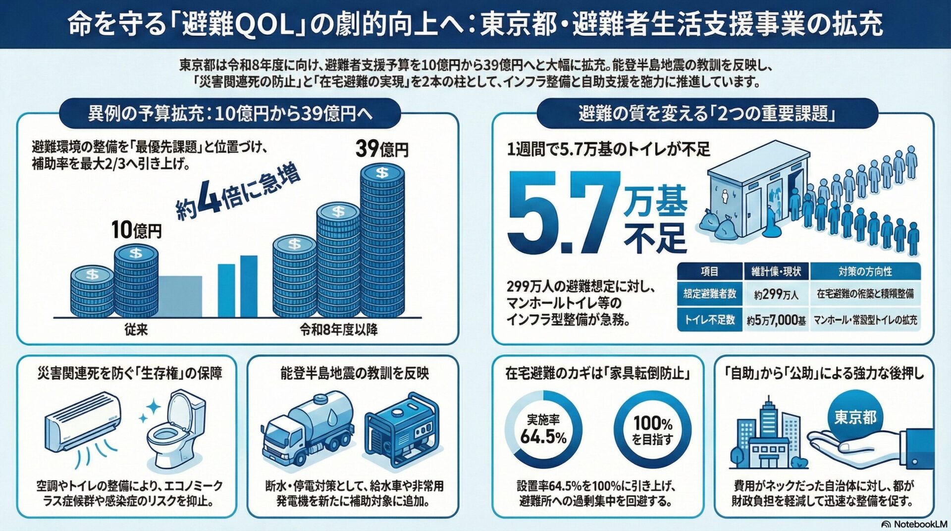 東京都による避難者生活支援事業の大幅な拡充は、都市のレジリエンスを「生存の質」という観点から再定義する画期的な動きです。39億円という予算は、特別区が抱える「避難所の過密」や「インフラの脆弱性」といった長年の課題を解決するための強力な武器となります。行政に求められているのは、単に予算を執行することではなく、数字に裏打ちされた現状の厳しさを直視し、都民一人ひとりが「災害時でも人間らしく生きられる」環境を先回りして構築することです。空調、トイレ、家具転倒防止といった具体的かつ切実なニーズに焦点を当てた本施策を最大限に活用し、特別区独自の創意工夫を加えた政策展開を行うことが、首都直下地震から住民を守り抜く唯一の道となります。本記事が示す方向性とデータの推移を、各区における防災計画の深化と、予算獲得のための強力な論拠として活用されることを期待します。
