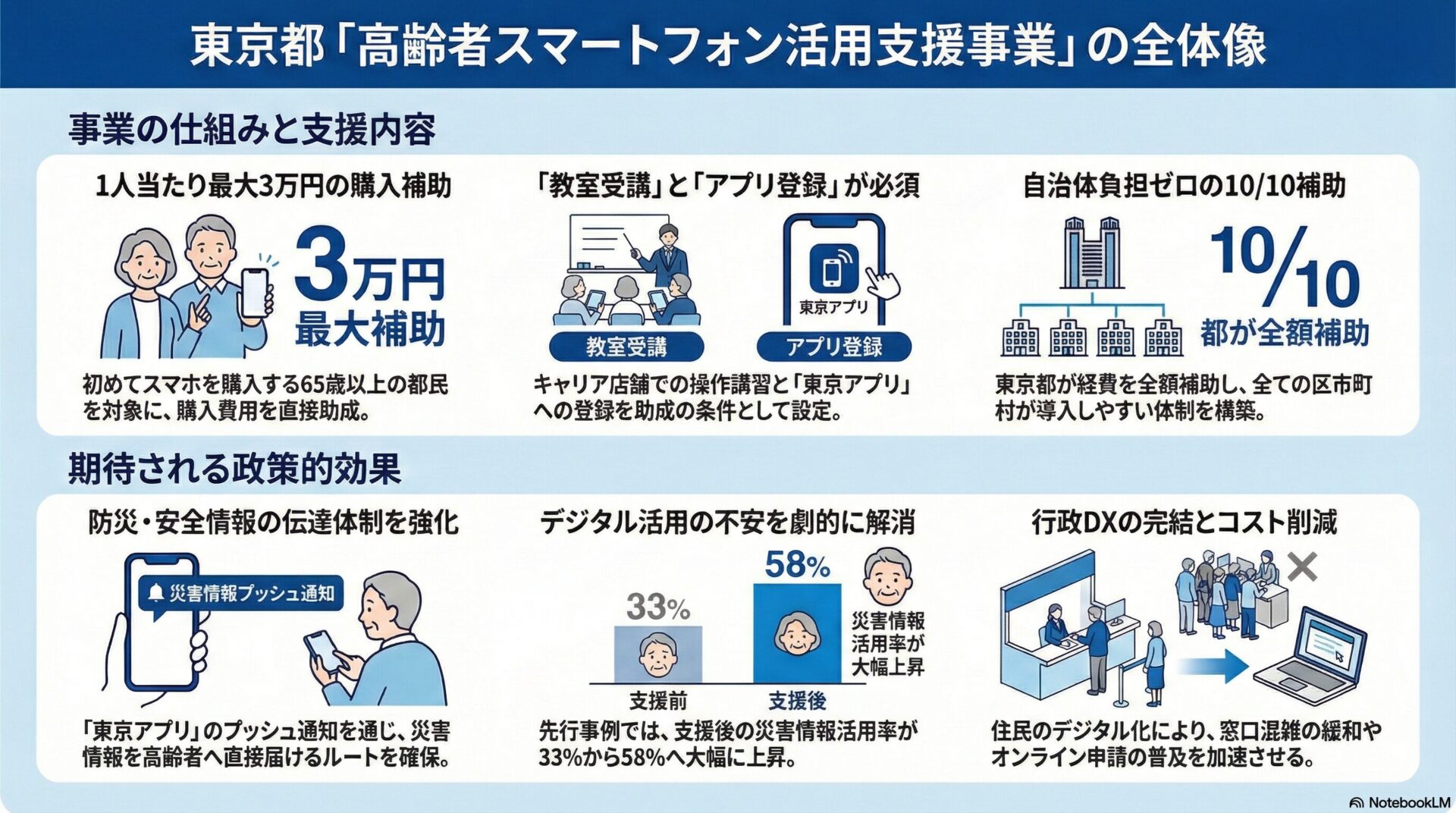 東京都による令和8年度のスマートフォン活用支援事業は、高齢者のデジタルデバイド解消を福祉の文脈だけでなく、都市のDXを完成させるための基盤整備として位置づけています。 1人当たり3万円という具体的なインセンティブを提示しつつ、教室受講とアプリ登録をセットにする手法は、デジタルへの入り口を広げ、確実な利活用へと導くための優れた政策設計です。