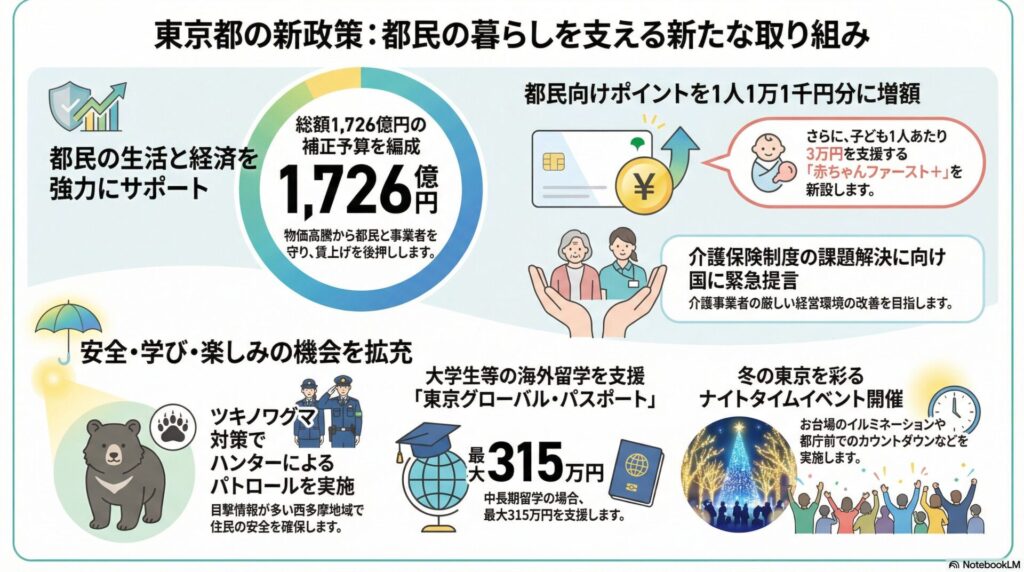 ニュース概要 - 物価高騰対策と中小企業の賃上げ支援を柱とする総額1,082億円の補正予算案が発表されました。主な事業として、都民の生活応援強化のため「東京アプリ」を活用し15歳以上の都民に1万1千ポイントを付与することや、新生児1人当たり3万円を支援する「赤ちゃんファースト+(プラス)」の実施が含まれます。また、中小企業向けには省エネ設備やDX推進機器の導入支援を拡充し、賃上げ環境の整備を図ります。