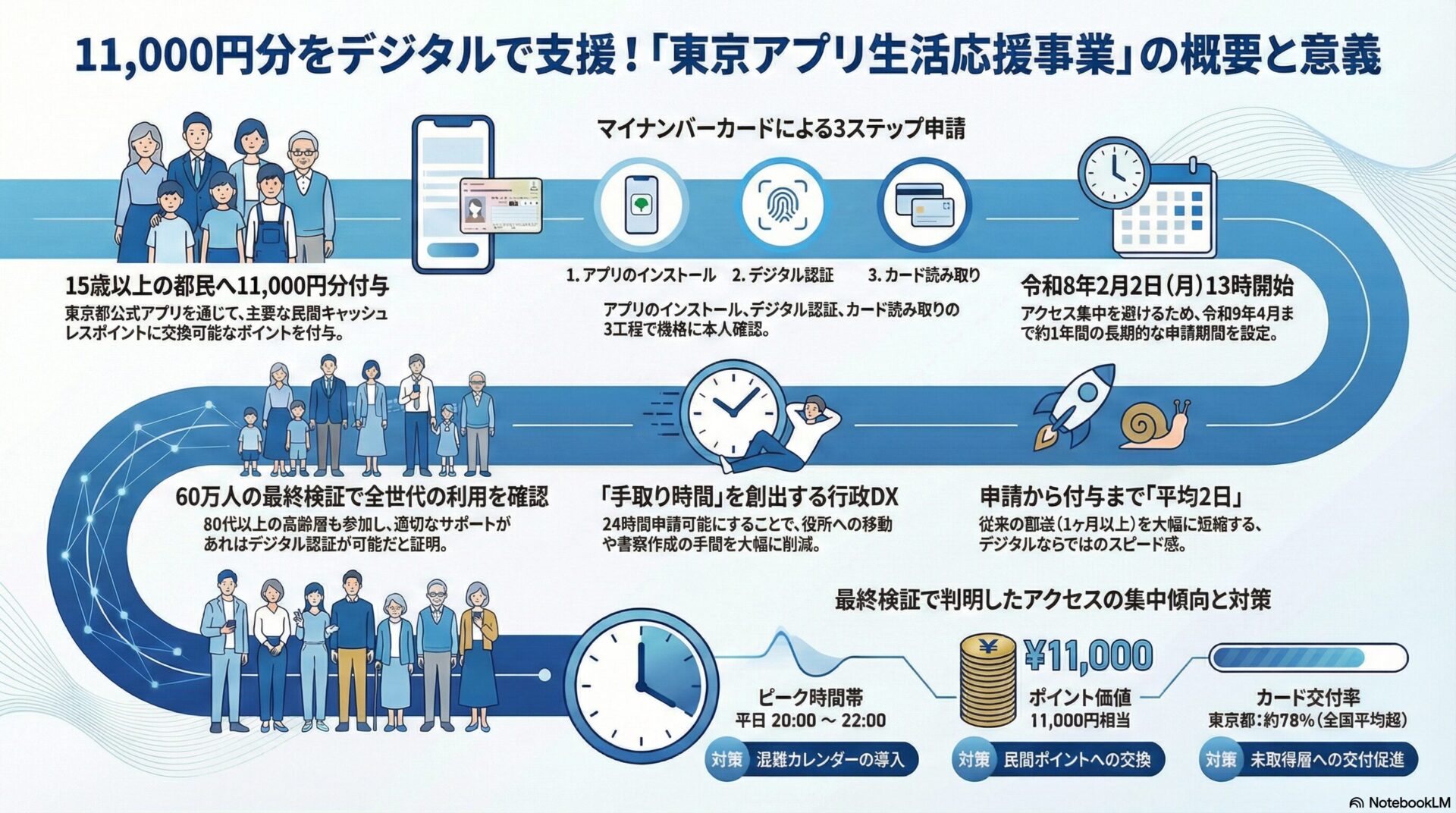 東京アプリ(ポイント付与)の開始時期と目的 - アプリは12月15日から検証を開始し、結果を踏まえて速やかにポイント付与を行う予定。行政手続きを一気通貫で行える「ポケットの中の都庁」を目指し、使い勝手を検証しながら進める。
