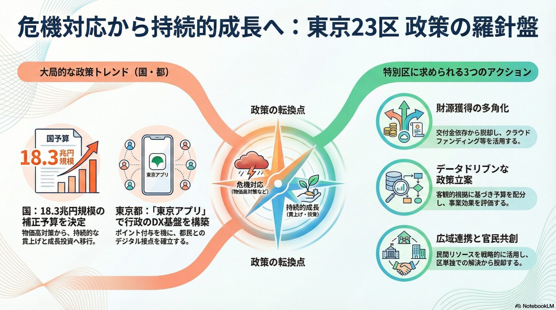 今まさに審議されている補正予算や条例改正は、来年度以降の区政の骨格を決める重要なプロセスです。本レポートで提示した他区の事例や国の動向をベンチマークとして、自区の施策を相対化し、ブラッシュアップするための材料として活用してください。