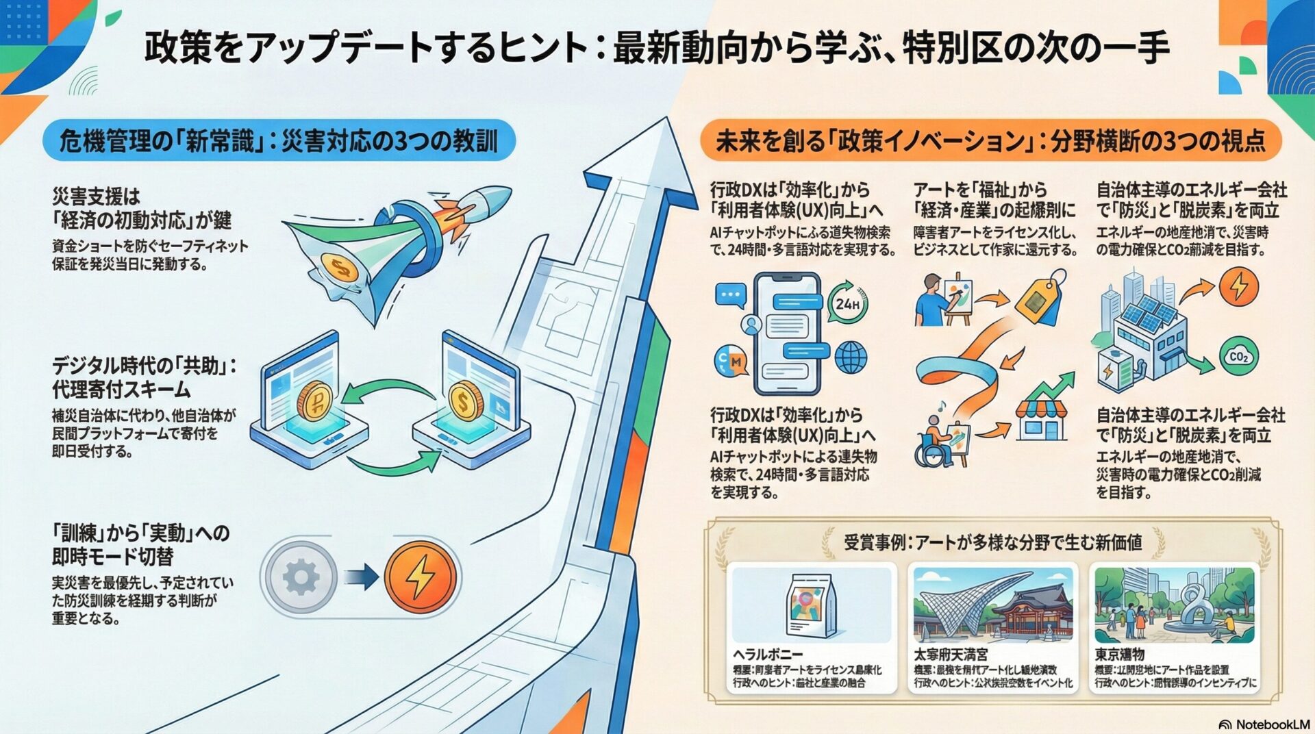 本レポートでは、これらの最新動向を「危機管理」「経済・文化」「環境・インフラ」「DX・行政改革」「福祉・人権」の5つの柱に分類し、東京都特別区(23区)の政策立案担当者が明日からの業務に活かせる具体的な視点とアクションプランを詳述します。単なる事実の羅列にとどまらず、背景にある行政課題や、他自治体での応用可能性について深掘りした分析を行います。