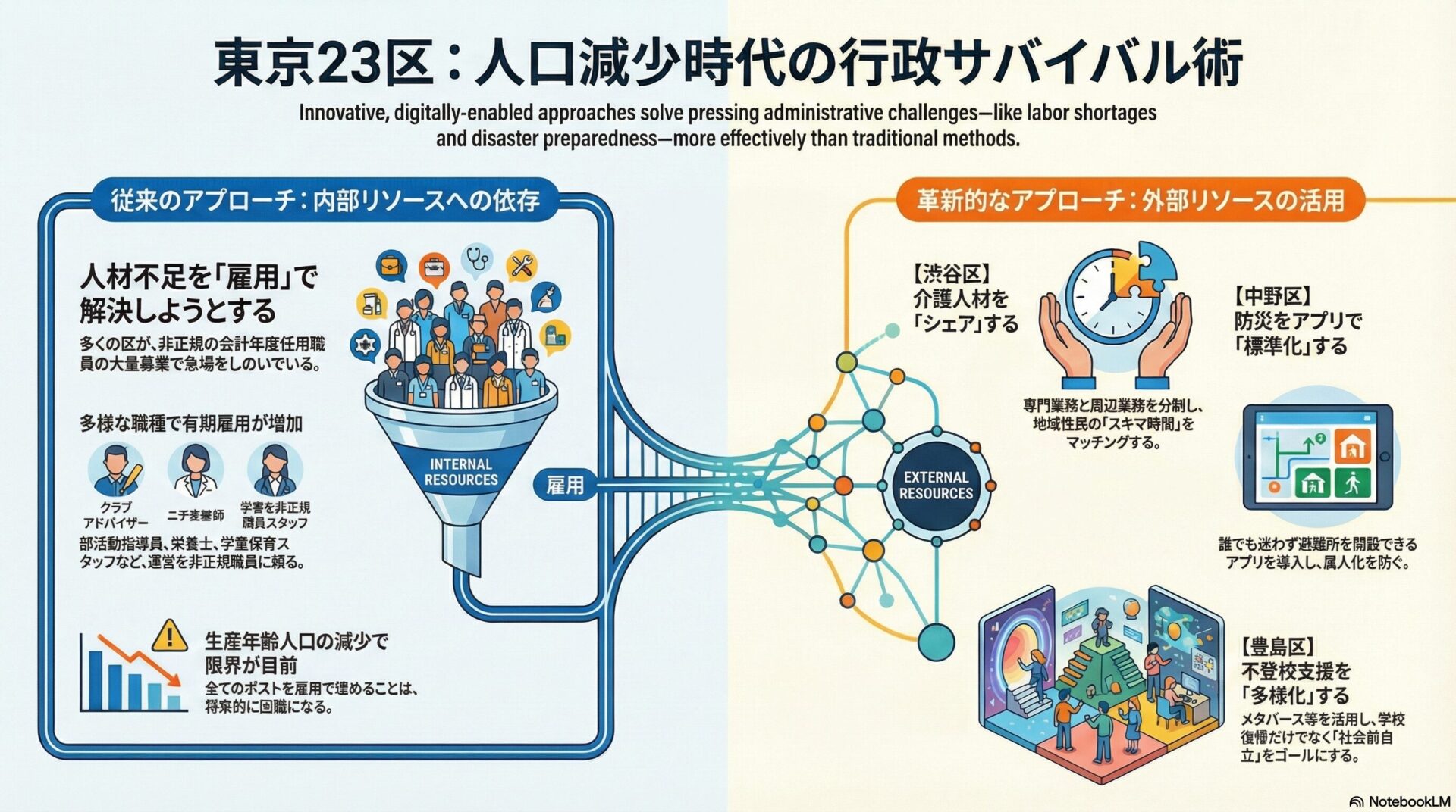 比較分析: 渋谷区のアプローチが「外部リソースの活用(アウトソーシング・シェアリング)」であるのに対し、他区の募集は「内部リソースの確保(インソーシング)」です。今後、生産年齢人口が急減する中で、全てのポストを雇用で埋めることは困難になるでしょう。渋谷区のように、業務の一部をボランティアやギグワーカーに開放する「業務のアンバンドリング(解体・再構築)」が、他の区でも不可避の検討課題となります。