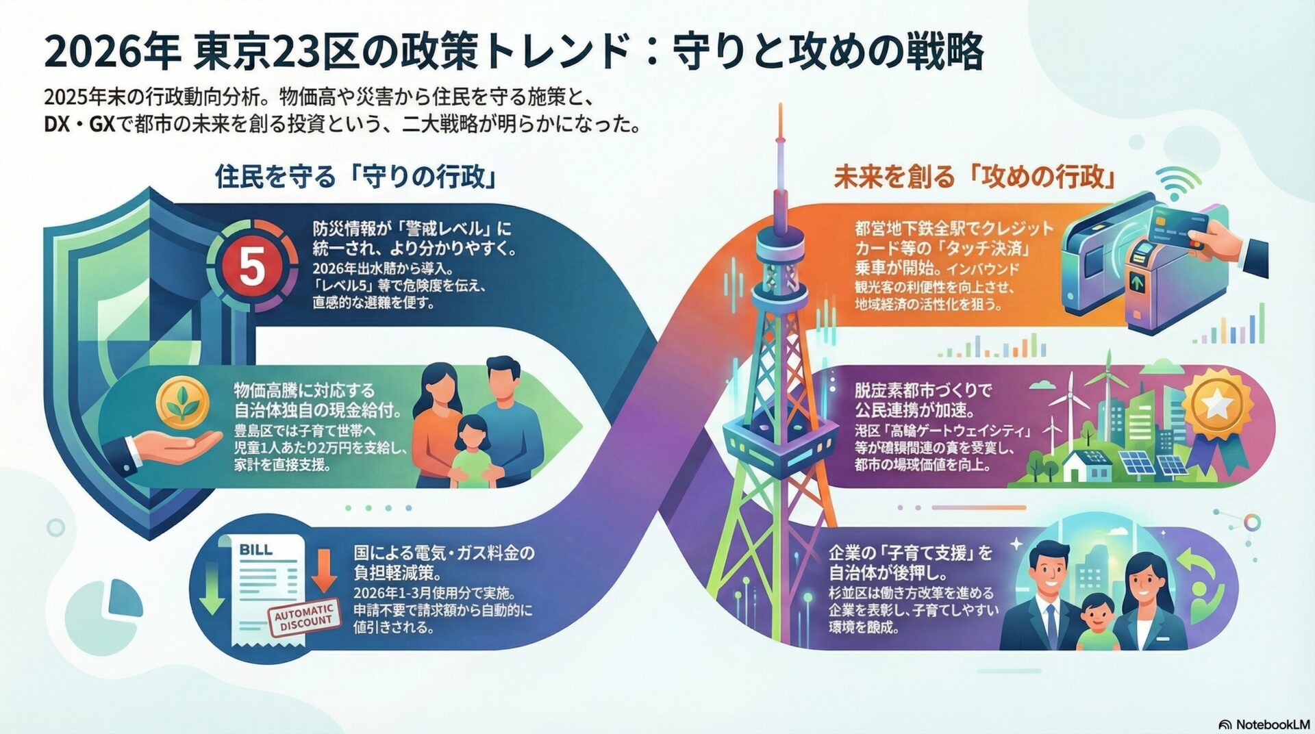 本レポートでは、これらのニュースを単なる時事情報の断片として扱うのではなく、今後の特別区の政策立案における重要な「先行指標」として捉え直す。特に、物価高騰に対する緊急的な経済支援策、激甚化する自然災害に対応するための法制度および情報伝達の抜本的改革、そして都市の持続可能性を担保するためのデジタルトランスフォーメーション(DX)とグリーントランスフォーメーション(GX)の実装という3つの巨大な潮流が、自治体経営にどのような変容を迫っているのかを体系的に論じる。