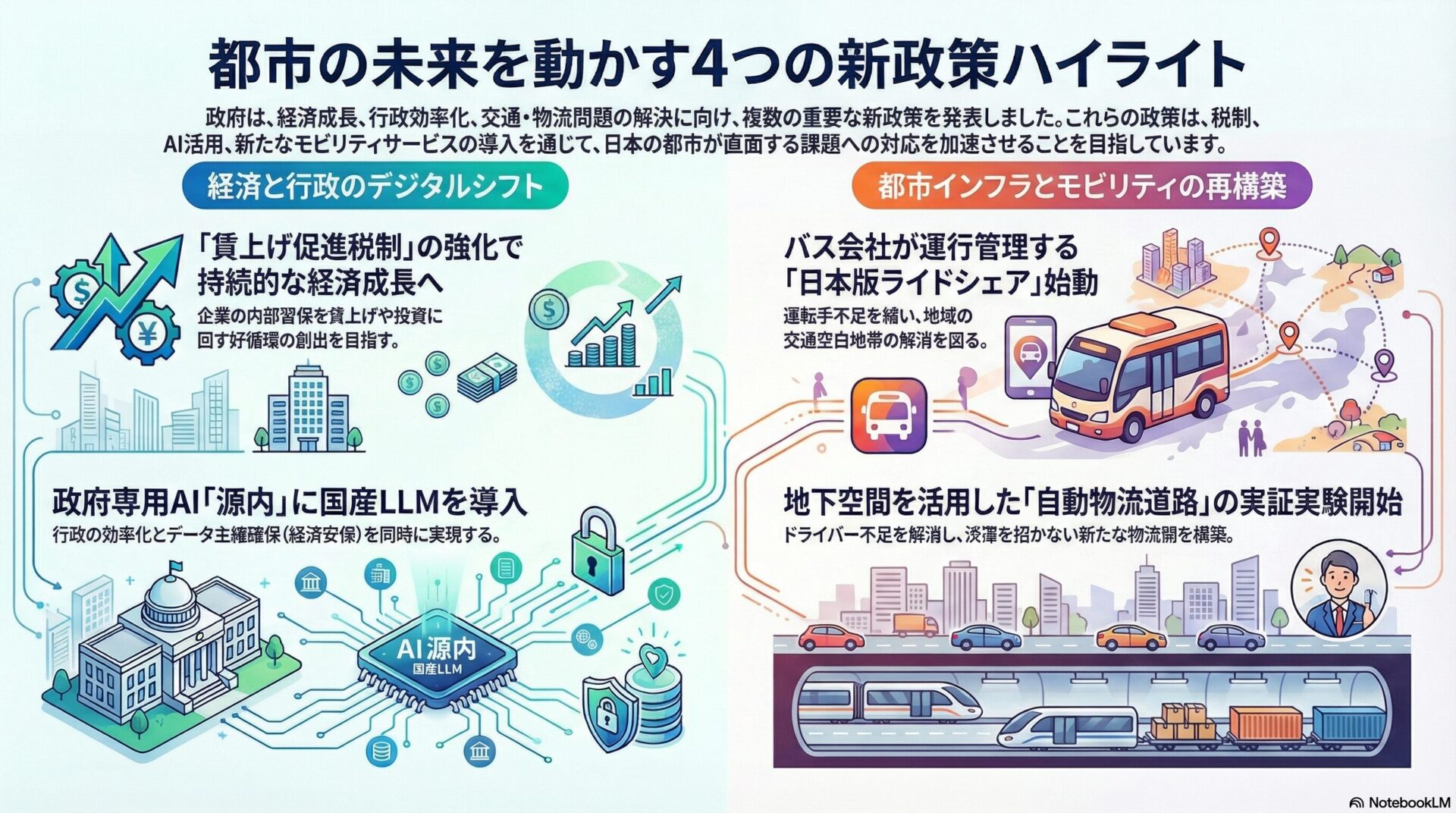 行政情報のセキュリティ確保(データ主権)と、日本語特有の行政用語や文脈を高精度に理解するAIの活用により、職員の業務効率を飛躍的に向上させ、少子高齢化による職員不足に対応するためです。 - 具体的なアクション