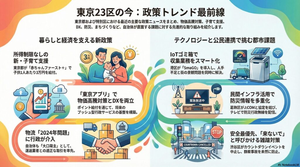 東京都は12月3日、総額1,726億円規模の補正予算案を発表しました。物価高騰に直面する都民生活と中小企業経営の下支えが主眼です。独自の「東京アプリ」を通じたポイント給付(最大1万1千円相当)や、所得制限を設けない子育て支援「赤ちゃんファースト+(プラス)」の創設などが柱となっています。