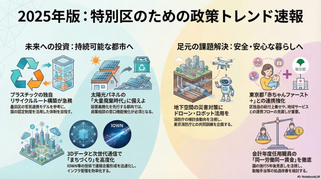 23区では、容器包装プラスチックだけでなく、製品プラスチックも含めた一括回収への移行が急務となっています。しかし、処理施設の確保やコストが課題です。墨田区のように、区内に立地あるいは近隣の有力なリサイクル事業者と直接連携し、国の認定を受けるスキームは、指定法人ルートに依存しない強靭な廃棄物処理体制の構築として、他区にとって極めて重要なモデルケースです。