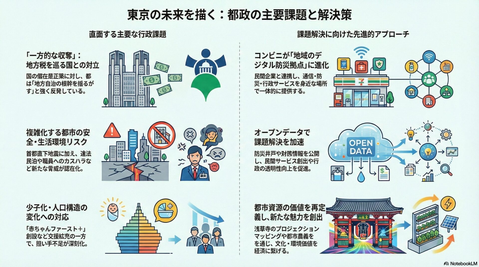 2025.12.08 2025.12.08 05 特別区(23区) 【2025年12月8日】行政関連ニュースと政策立案のヒント masashi0025 ※本記事はAIが生成したものを加工して掲載しています。※掲載内容を使用する際は、各行政機関の公表資料を別途ご確認ください。 目次 社会経済状況地方税財源の偏在是正措置に対する東京都の反論環境政策エコツーリズム推進基本方針の見直しとパブリックコメント福島第一原発ALPS処理水のIAEA枠組みによる採取・分析DX政策練馬区 オープンデータの拡充(公衆無線LAN、財務情報、防災井戸等)総務管理公務員の服務規律とカスハラ対策(江戸川区・中央区の事例)公正取引委員会による独占禁止法教室の開催防災政策首都直下地震の被害想定縮小と地下空間での救助技術高度化生活安全政策違法民泊への廃止命令の発出経済産業政策全国都市農業フェスティバル2025と日ASEAN若手リーダー交流子育て、子ども政策「赤ちゃんファースト+」の創設の動きこども家庭審議会「科学技術部会」の開催健康、保健政策伝染性紅斑(リンゴ病)の流行と感染症対策医薬品等行政評価・監視委員会の開催文化政策郷土資料館・東京都公文書館連携事業「江戸の町名主」展福祉政策障害者週間関係表彰式の実施とパラスポーツフォーラムの募集厚生労働省によるシベリア抑留者遺骨収集・身元特定社会経済状況 地方税財源の偏在是正措置に対する東京都の反論 概要 出典 東京都知事記者会見(2025年12月5日) ニュース概要 政府・与党が進める地方税収の「偏在是正策」に対し、小池百合子東京都知事が定例会見で強く反論を行いました。知事は、東京都の税収が他の自治体に比べて豊かであるとされる現状に対し、「東京を狙い撃ちにするような一方的な収奪」であり、「地方自治の根幹を否定するもの」であると強い不快感を表明しました。具体的には、東京都の一人当たりの一般財源額は全国平均とほぼ同水準であり、見かけ上の税収増は膨大な昼間人口や企業集積に伴う財政需要(インフラ維持、防災対策、治安維持など)によって相殺されていると主張しています。また、知事は「パイの奪い合いをしている限り成長はない」と述べ、国全体の経済パイを拡大することこそが重要であると強調。地方創生の名の下に都市部の活力を削ぐような施策は、結果として日本全体の競争力低下を招くと警鐘を鳴らしています。 政策立案への示唆 この取組を行政が行う理由 自治体の財政自立権を守るためです。地方税財政制度において、特定の自治体から財源を吸い上げ、他の自治体に再配分する措置が過度に進めば、自治体ごとの自助努力や行財政改革のインセンティブが失われます。特に特別区を含む東京都は、地方交付税の不交付団体として独自の財政運営を行っており、国による一方的な財源移転は、都民・区民への行政サービス水準の低下に直結しかねない重大な脅威となります。また、都市部のインフラ更新や防災対策には巨額の費用が必要であり、税収のみを見て「富裕」と判断されることへの危機感があります。 具体的なアクション 特別区長会を通じた東京都との連携強化、および国へのロビー活動の展開が必要です。また、区民に対して、自分たちが納めた税金がどのように使われ、あるいは国に吸い上げられようとしているのかを分かりやすく広報し、世論を喚起することが求められます。具体的には、区報やウェブサイトでの「税の使い道」特集の拡充や、シンポジウムの開催などが考えられます。さらに、各区の財政需要(特に昼間人口対策や老朽化インフラ対策)を数値化し、東京都と共有することで、反論の論拠を強化する作業が急務です。 行政側の意図 地方税財源の都市部から地方への移転(偏在是正)の流れを食い止め、東京都および特別区の財政基盤を堅持することです。また、国に対して、安易な再配分ではなく、地方税財源そのものの拡充や権限委譲を求めるという、地方分権本来のあり方を問う意図もあります。さらには、来年度予算編成に向けた防衛線を張る狙いもあります。国政における「東京富裕論」に対抗し、実質的な財政需要の大きさをアピールすることで、制度改正の議論を有利に進めたいという政治的な意図も含まれています。 期待される効果 政府・与党内の議論に対する牽制効果が期待されます。また、都民・区民の財政に対する関心を高め、行政と住民が一体となって地域の富を守るという意識の醸成につながります。長期的には、都市部の特殊事情(地価の高さ、行政コストの高さ)を加味した、より公平な財政需要の算定ルールの見直し議論へとつなげることが期待されます。これにより、特別区の財政予見可能性が高まり、中長期的な投資計画の策定が容易になるという副次的効果も見込まれます。 課題・次のステップ 「東京は金持ち」という全国的なステレオタイプや、地方選出議員が多い国政の力学に対抗することの難しさが課題です。単なる「反対」だけでなく、都市部が牽引する経済成長が地方に