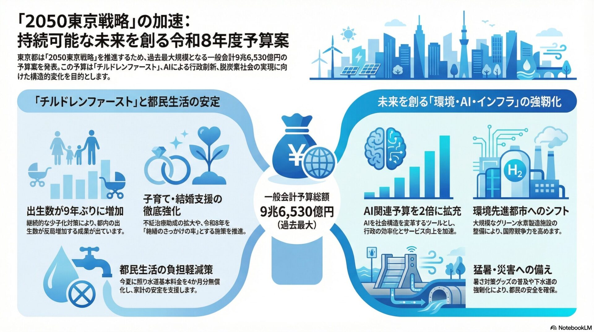 - 都は「2050東京戦略」の推進と、過去最大規模となる一般会計9兆6,530億円の令和8年度予算案を発表しました。都内の出生数が9年ぶりに増加するなど成果が表れる中、チルドレンファーストの強化、不妊治療助成の拡大、都立大学の国際化、グリーンスイソ製造施設の整備などを盛り込みました。また、都民生活応援として、今夏に限り水道基本料金を4か月分無償化する方針も示されました。