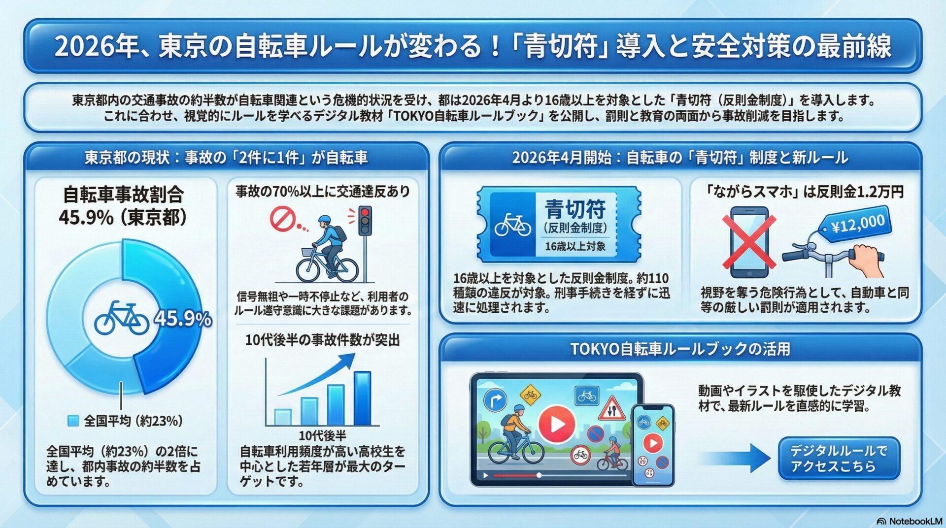 - 4月からの自転車の青切符制度導入を受け、ながらスマホなどの交通違反や基本ルールをイラストと動画で解説したデジタル版「TOKYO自転車ルールブック」を公開しました。