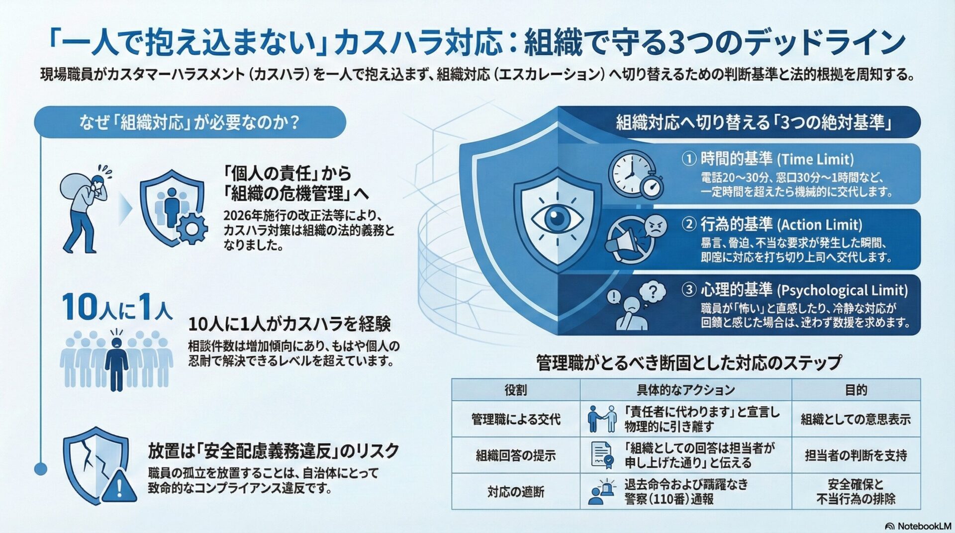 しかし、現代の法解釈および危機管理の原則において、一人の職員に過酷なクレーム対応を背負わせることは、組織の「安全配慮義務違反」を構成する極めて危険な状態です。東京都カスタマー・ハラスメント防止条例の施行、および2026年10月に迫る改正労働施策総合推進法の施行により、カスハラへの対応は「個人の接遇スキル」から「組織の危機管理システム」へと完全に移行しました。