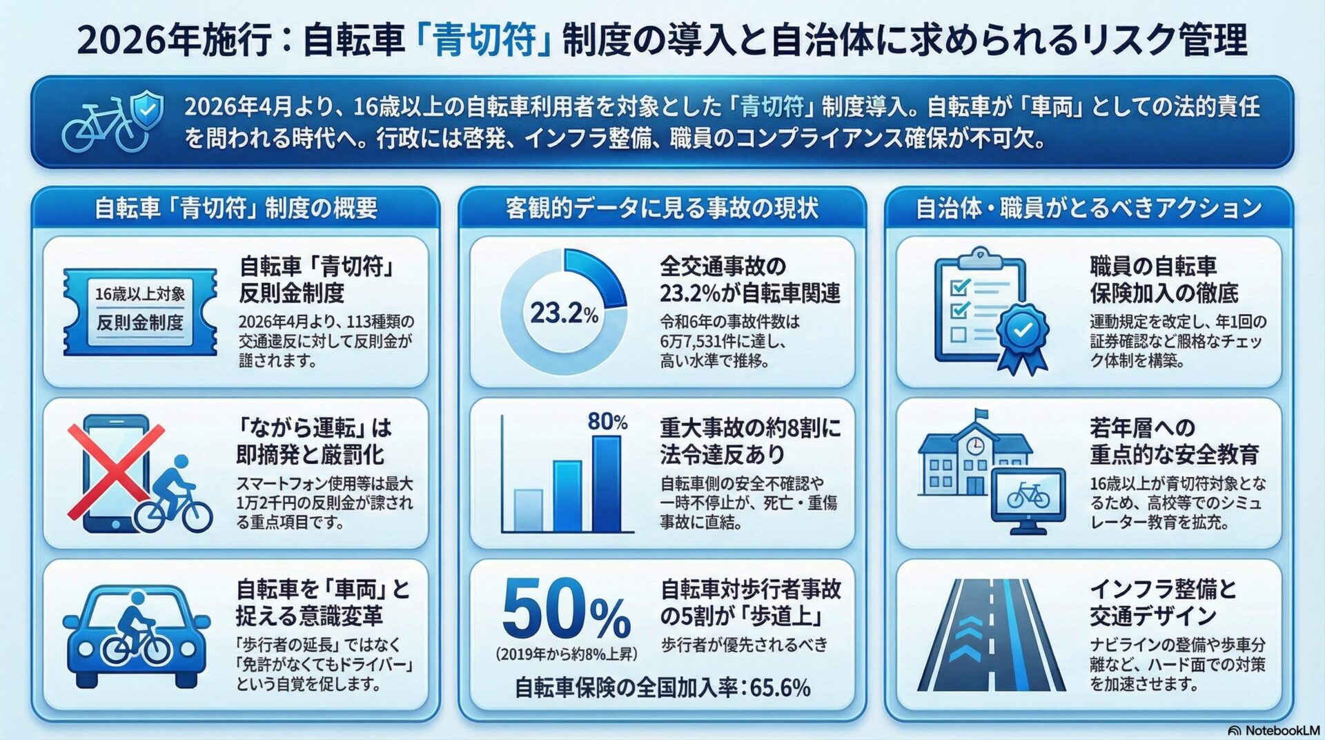 本制度の最大の意義は、これまで「交通弱者」として保護の対象と見なされがちであった自転車利用者が、明確に「車両の運転者」としての法的責任を問われる新たなフェーズに突入したことを、行政担当者に強く認識させる点にあります。 悪質・危険な自転車運転による死亡・重傷事故の多くに自転車側の法令違反が関与しており、青切符の導入はこれに歯止めをかけるための国家的な処方箋です。 さらに、自治体が率先して職員に自転車保険への加入を義務付けることは、組織の危機管理(リスクマネジメント)の観点から不可欠なアクションとなります。 特別区の行政担当者がこの制度改正と客観的データを理解し、効果的な交通安全対策や職員教育を立案・実行するための強固な土台となる点で、極めて重要な意義を持ちます。
