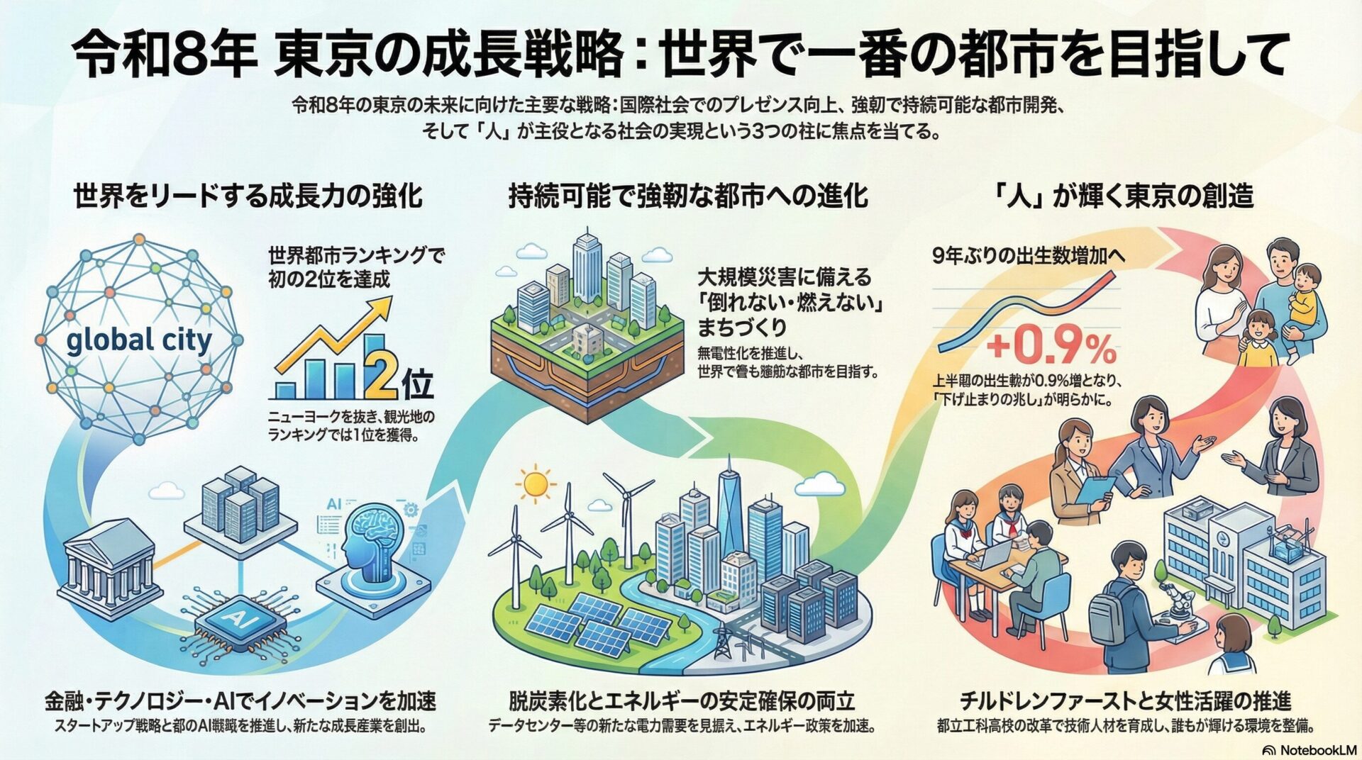本記事は、令和8年(2026年)の東京都知事新年あいさつを基に、最新の都政動向と客観的データに基づいた政策立案の指針を整理したものです。東京は現在、世界都市総合力ランキングで史上初となる第2位へ躍進し、長年停滞していた出生数も9年ぶりに増加へ転じるなど、歴史的な転換点を迎えています。知事のメッセージでは、従来のデフレ型思考から脱却し、強靭な都市(レジリエンス)と次世代人材、そしてAI・スタートアップへの「攻めの投資」を加速させる方針が明確に示されました。特別区の公務員にとって、これらの都の戦略を各地域の施策にどう反映させ、住民の「叶えたい」を形にするかが、令和8年度以降の最重要課題となります。