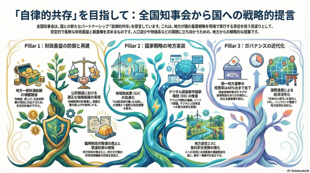 全国知事会による一連の提言は、地方自治体が直面する「カネ、ヒト、制度」の構造的な課題を浮き彫りにしています。