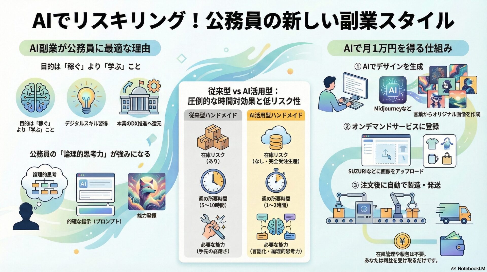 従来、ハンドメイド副業は手先の器用さや制作時間を要するため、多忙な職員にはハードルが高い側面がありました。しかし、画像生成AI(Midjourney等)とオンデマンド印刷サービス(SUZURI等)の台頭により、「在庫リスクなし」「短時間」「手先が不器用でも可」という、公務員にとって理想的な環境が整いました。
