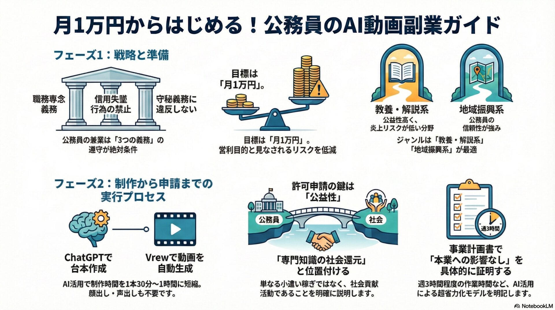 本報告書では、動画配信を単なる私的な営利活動としてではなく、「公務員の専門性や地域貢献に資する知見の社会還元」と再定義することを提唱する。生成AI(ChatGPTやVrew等)を活用することで、企画・制作にかかる時間を劇的に圧縮し、業務時間外の負担を最小限に抑える「超省力化モデル」を構築することが、公務と兼業の両立における核心的な成功要因となる。また、収益化においては、月10万円以上の過度な収益を目指す商業主義的なアプローチを排し、月1万円程度の安定的かつ小規模な収益モデル(「小商い」)を目標とすることを推奨する。これにより、営利企業への従事とみなされるリスクを低減し、兼業承認の蓋然性を高めると同時に、住民からの批判を回避する倫理的な防波堤を築くことが可能となる。