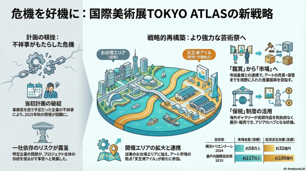 国際美術展「TOKYO ATLAS」は、当初の計画変更という苦難を乗り越え、より強靭で戦略的なプロジェクトへと進化しようとしています。横浜や瀬戸内といった先行事例の数字が示す通り、成功すれば数十億円規模の経済効果と、プライスレスな都市ブランドの向上が見込まれます。