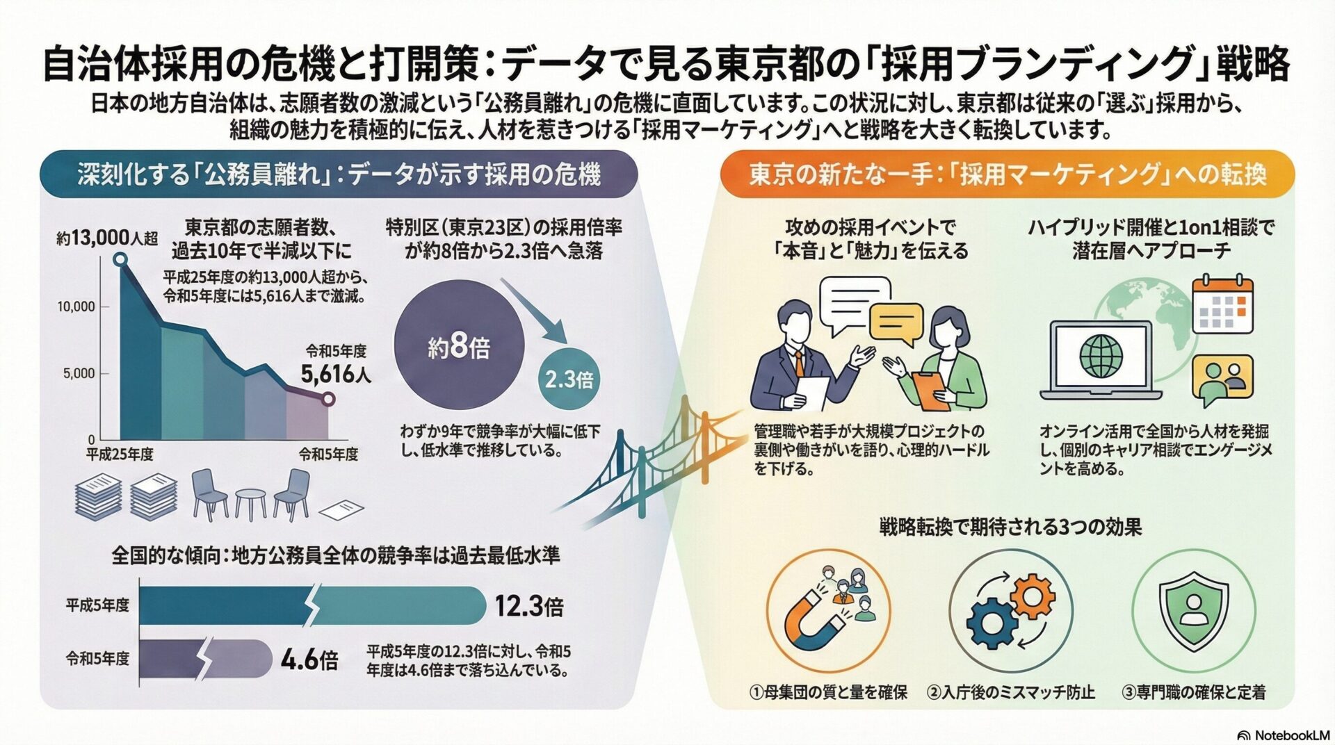 本記事では、過去10年の採用志願者数推移などの客観的データを用い、自治体が直面する現状を分析するとともに、特別区(東京23区)を含む各自治体が今後取り組むべき政策立案の視点を提示します。