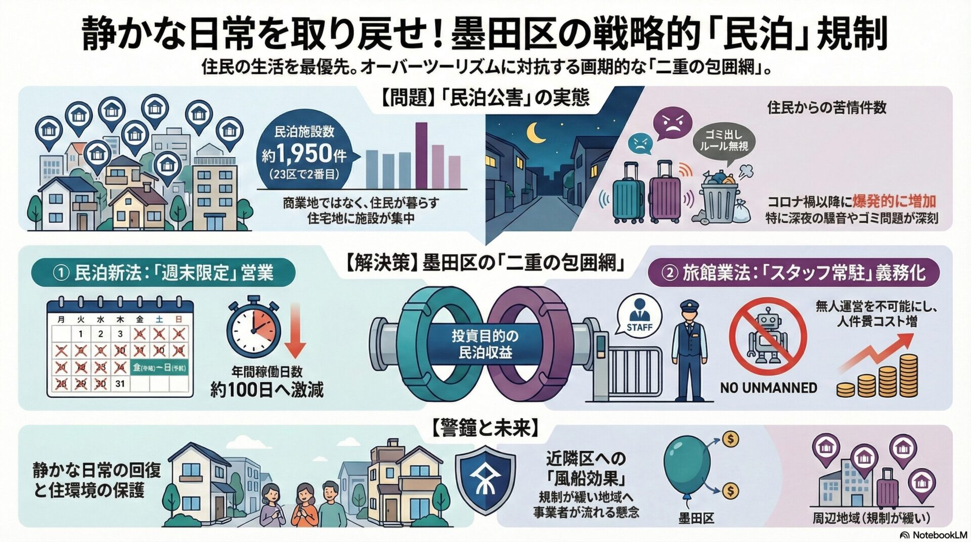 墨田区による民泊規制強化および旅館業法条例改正は、単なる行政手続きの変更ではありません。これは、「地域住民の平穏な生活権」を「無秩序な経済活動」よりも明確に上位に置くという、地方自治の決意表明です。