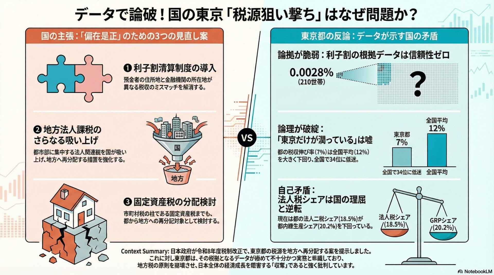 令和7年12月19日に与党が取りまとめた令和8年度税制改正大綱において、東京都の税源を標的とした極めて重大な方針が示されました。 本記事では、小池知事の記者会見に基づき、国が進める「利子割清算制度の導入」「地方法人課税のさらなる吸い上げ」「固定資産税の分配検討」という三つの論点を整理します。 知事は、これらの見直しが極めて不十分な統計データに基づいており、地方税の原則である「応益性」や「住所地課税」を否定するものであると強く批判しています。 特に、東京の経済成長が日本全体の国益に直結する中で、安易な税収の奪い合いは国家としての成長戦略を阻害する恐れがあります。 本記事は、特別区の自治体職員が直面する財源リスクと、政策立案における論理的な対抗軸を明確にすることを目的としています。