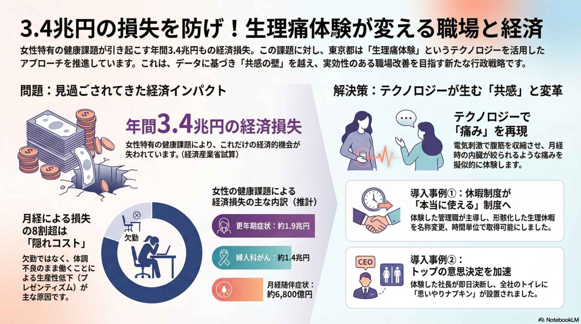 東京都の「女性活躍推進条例案」と「生理痛体験」の指針化は、一見すると奇抜な施策に映るかもしれません。しかし、その背後には、年間3.4兆円という看過できない経済損失のデータと、従来の啓発活動だけでは超えられなかった「共感の壁」をテクノロジーで突破しようとする、極めてロジカルな行政判断が存在します。