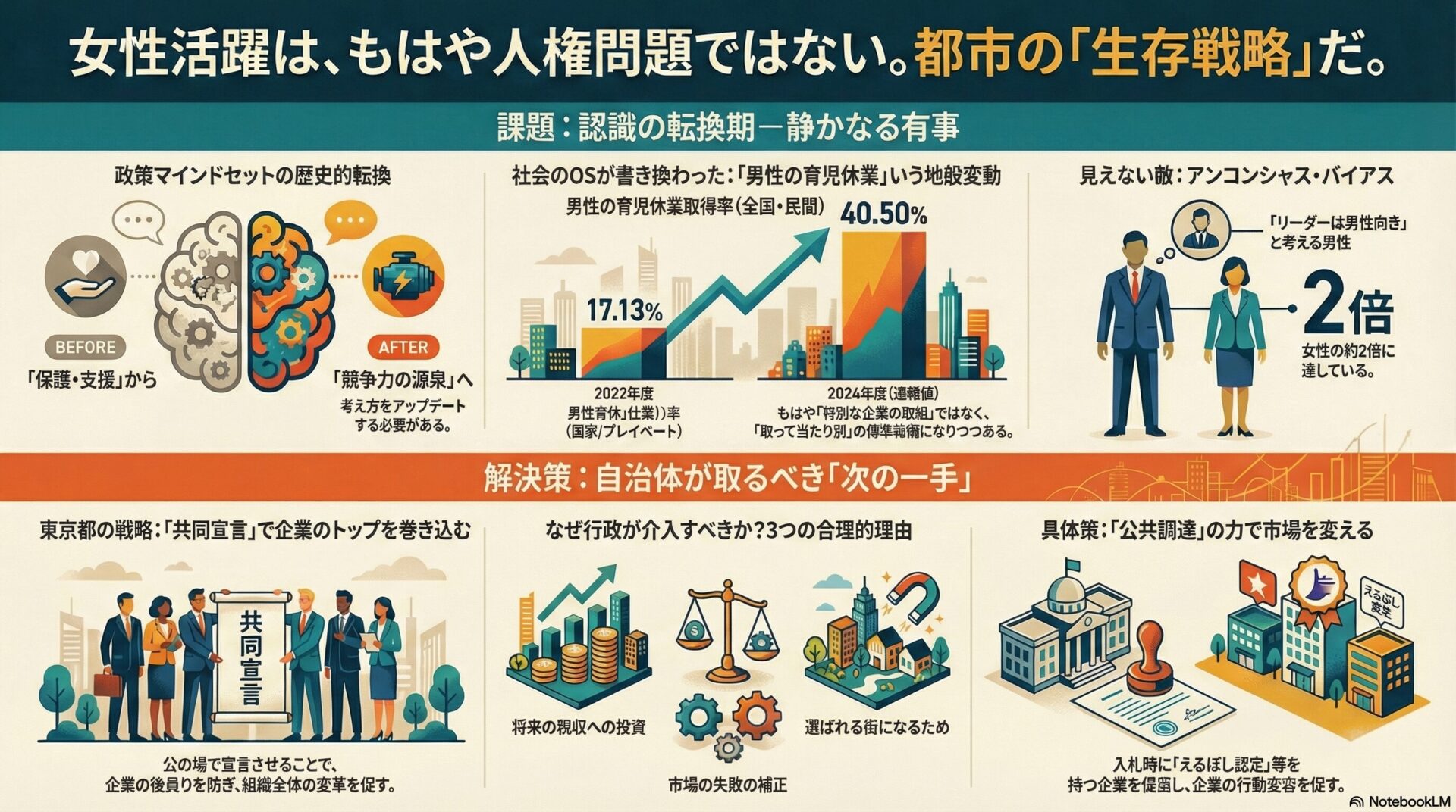 - 施策案:男性職員育休取得率100%宣言と「業務棚卸し」のノウハウ公開